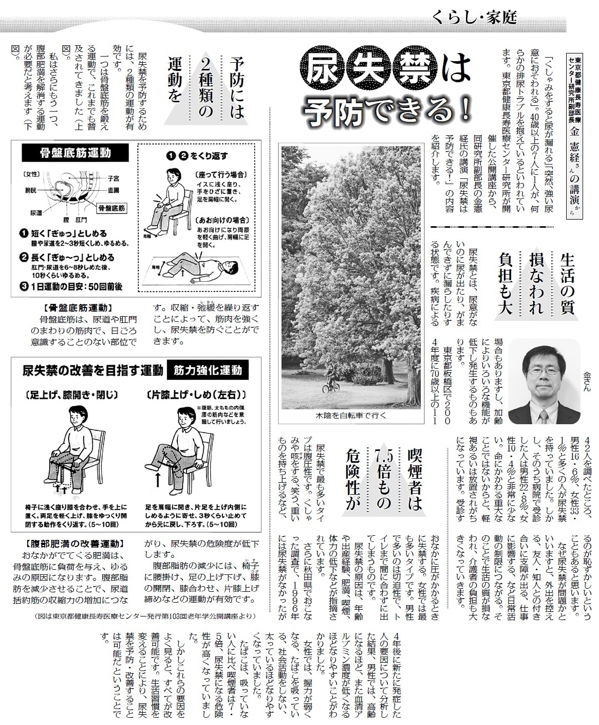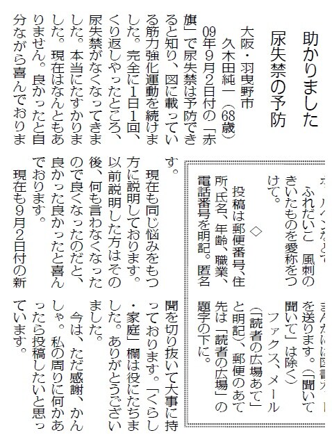 「助かりました 尿失禁の予防」。5日付「読者の広場」には、こんな見出しで投稿が掲載されました。「くらし・家庭面」に出た尿失禁予防の記事(09年9月2日)を見て、筋力強化を続け、「尿失禁がなくなった」という投書です。これに「記事のコピーを送って」などの電話やファクスが約20件。「くらし・家庭面」では、要望にこたえて来月早々新たな「尿失禁対策」の記事を予定しています。