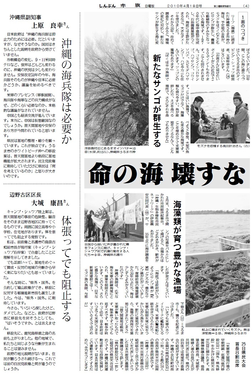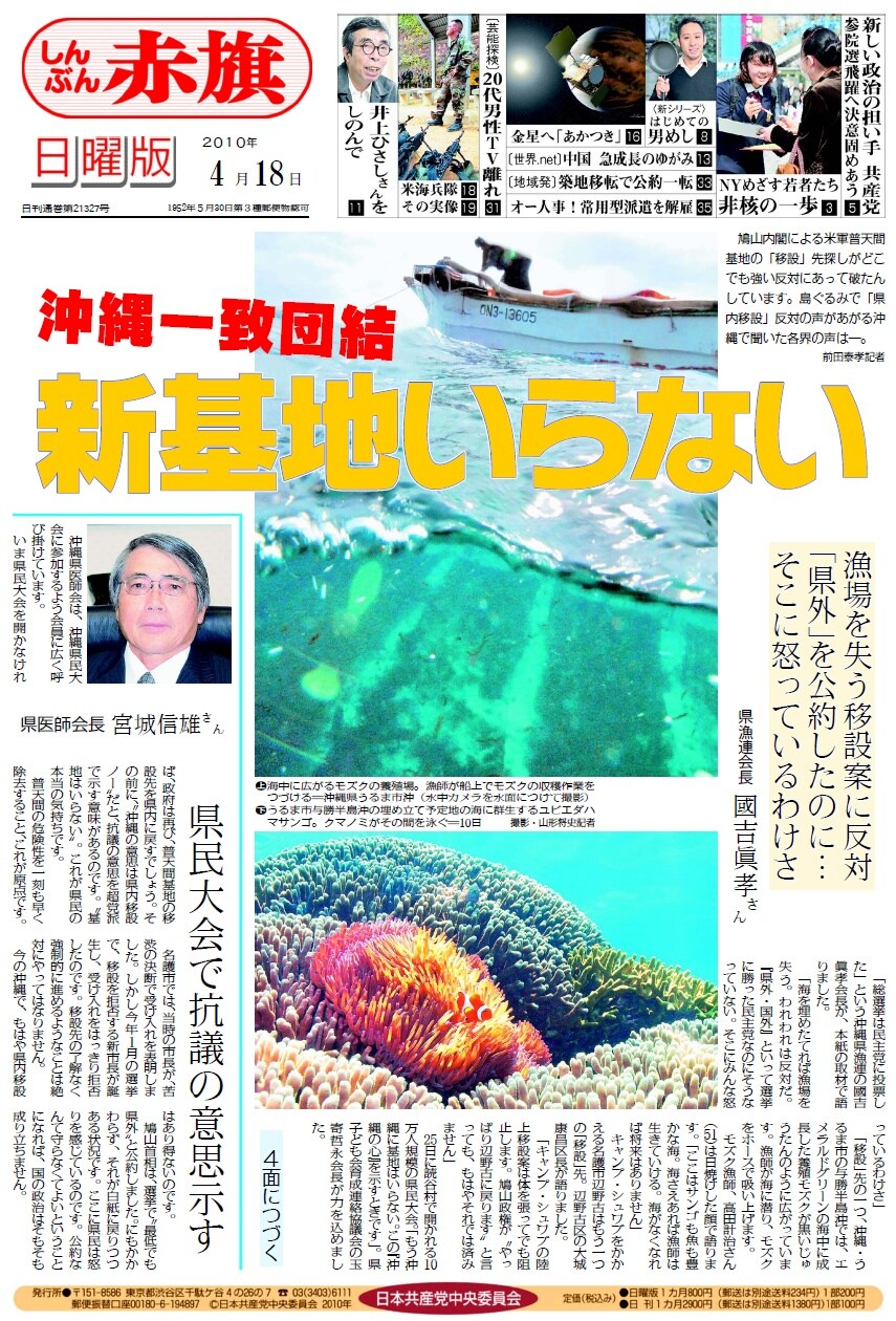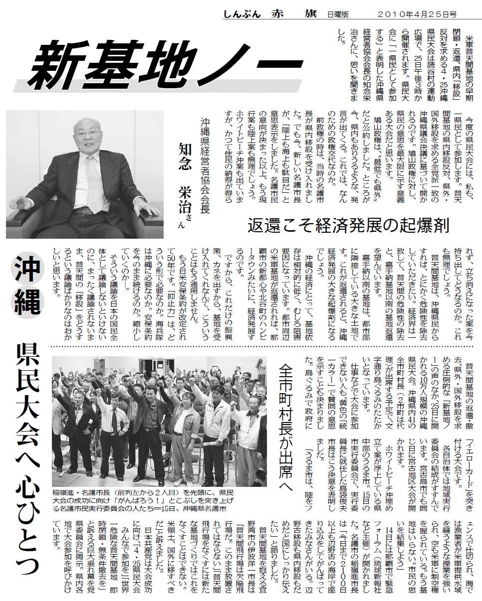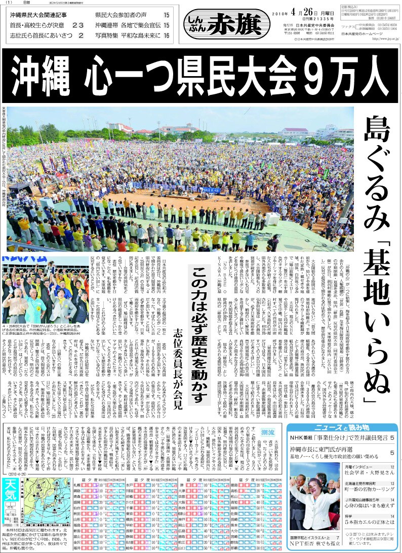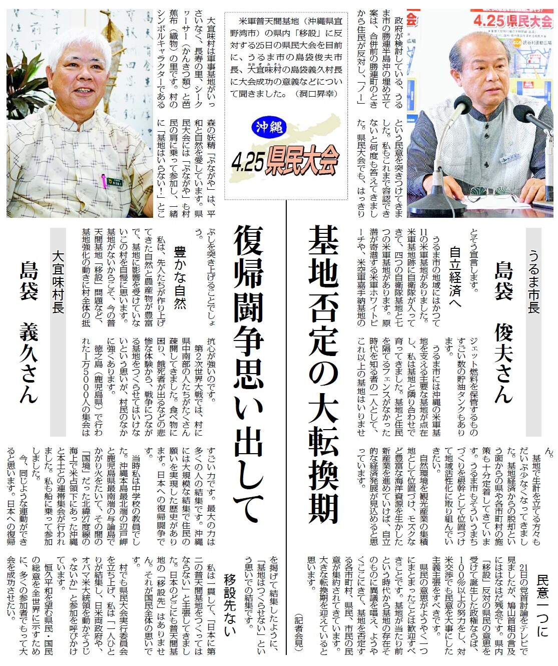 県民大会にむけ、「沖縄4・25県民大会」のシリーズ見出しで沖縄県内の市町村長や各界代表のインタビューを掲載(4月10日付から)。県議会議長、県子ども会育成連絡協議会会長、県婦人連合会会長も登場し、「沖縄は戦後65年も米軍基地を押し付けられてきました。これは暴挙です。日本政府が国民の政府であるなら、もうやめるべきです」(県婦人連合会会長)などと訴えています。