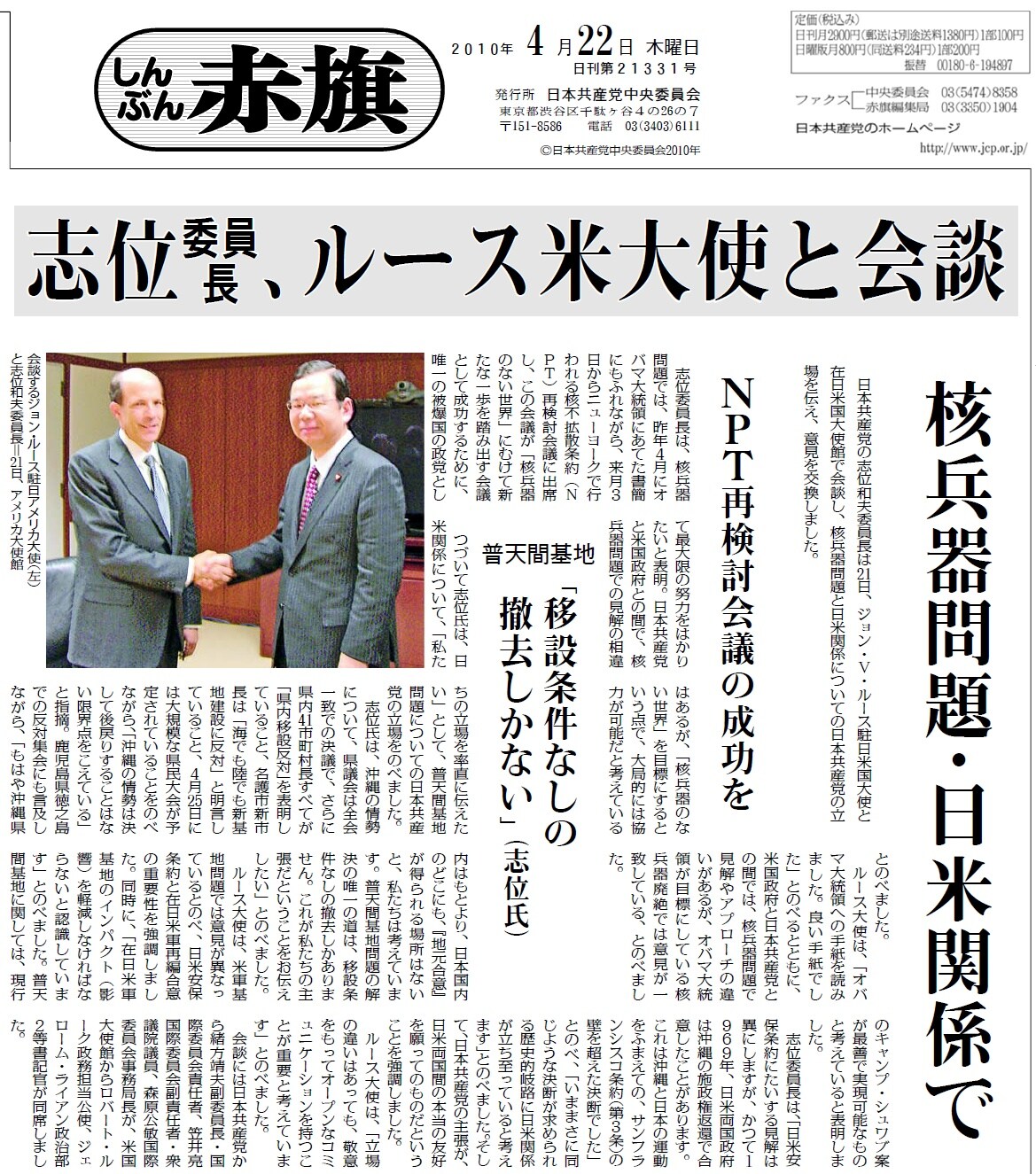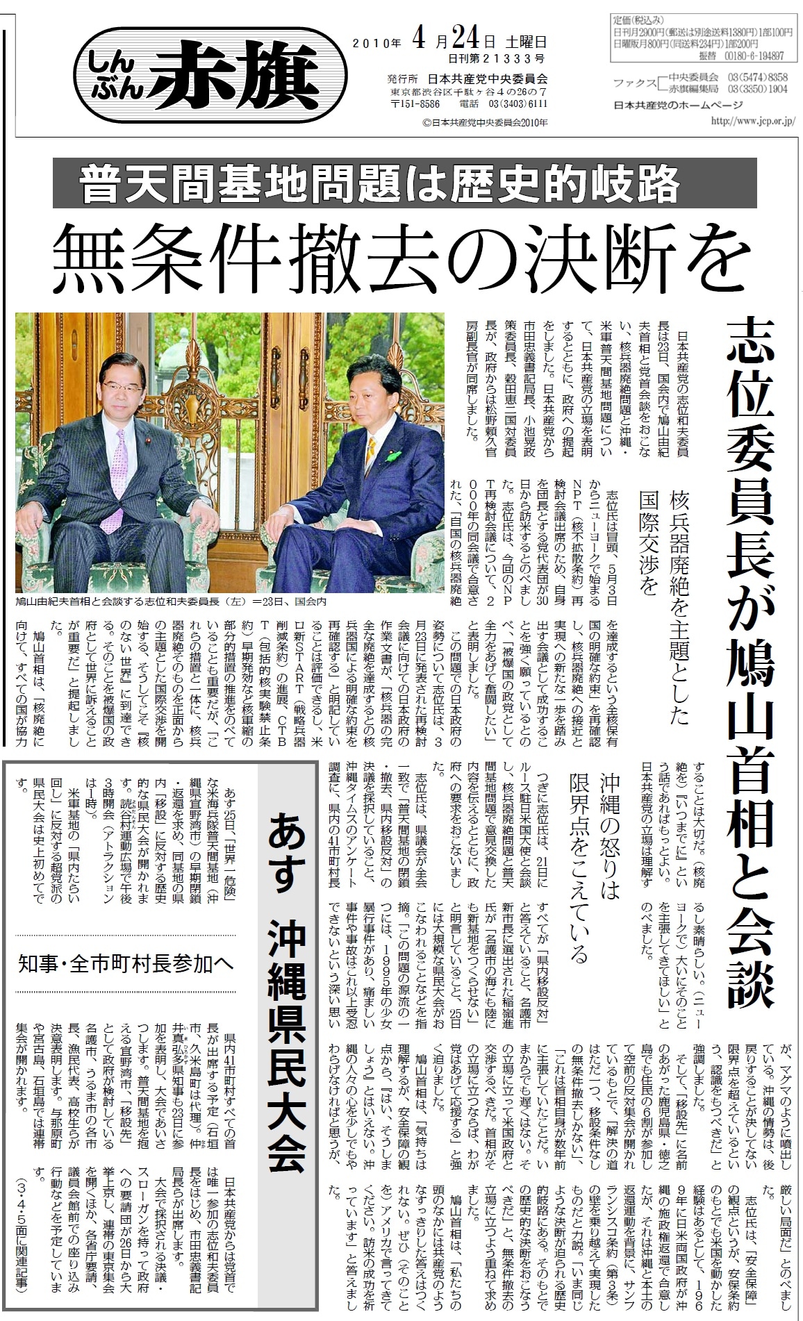 22日付では、志位和夫委員長がルース駐日米国大使と会談し、「普天間基地問題解決の道は、移設条件なしの撤去しかない」と伝えたことを報じ、24日付では、志位委員長が鳩山首相との会談でもこの立場に立つよう強く求めたことを報じています。