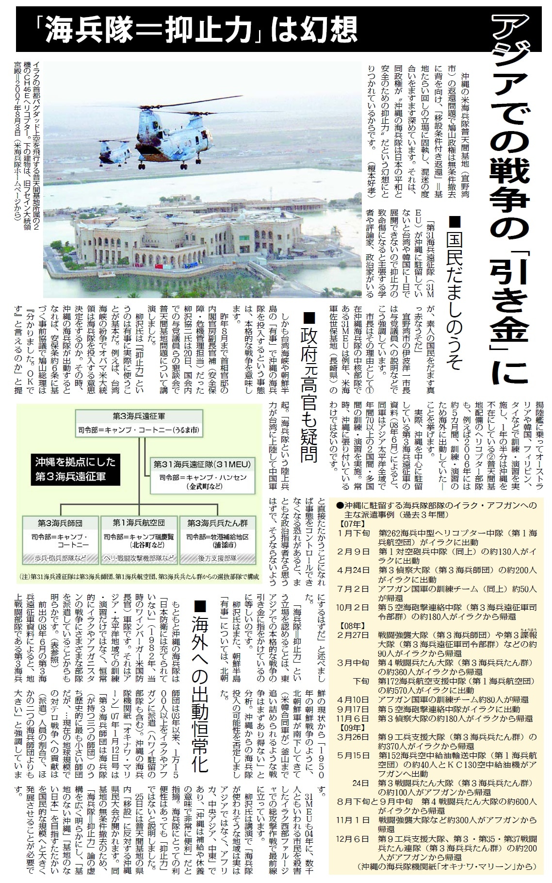「赤旗」は、鳩山政権も日本のほとんどのマスメディアも縛られている「海兵隊は抑止力」という誤った見方を繰り返し批判。23日付では〈「海兵隊=抑止力」は幻想 アジアでの戦争の「引き金」に〉と、沖縄海兵隊の過去3年間のイラク・アフガンへの派遣事例も示して論証しています。