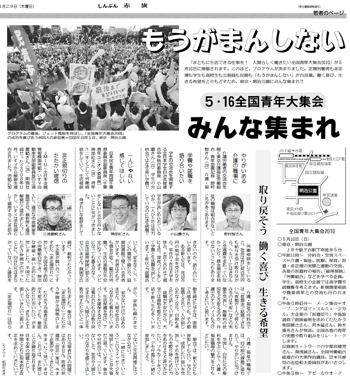 青年の「生きづらさ」や「自己責任論」がまん延するなか、その背景に迫って青年に寄り添い、生き方、解決への道を共に考えるページが「ゆうPRESS」です。中小企業の魅力に焦点を当てた「就活(就職活動) まだ間に合う」、日本の公的住宅供給と家賃補助の現状に欧州との比較でメスを入れた「ある?ない?どうなってる家賃補助」などの企画を特集しています。4月29日付では、「全国青年大集会2010」(5月16日、東京・明治公園で開催)に向けて労働組合、青年・学生団体の青年が、それぞれの思いや意欲を生きいきと話しています。