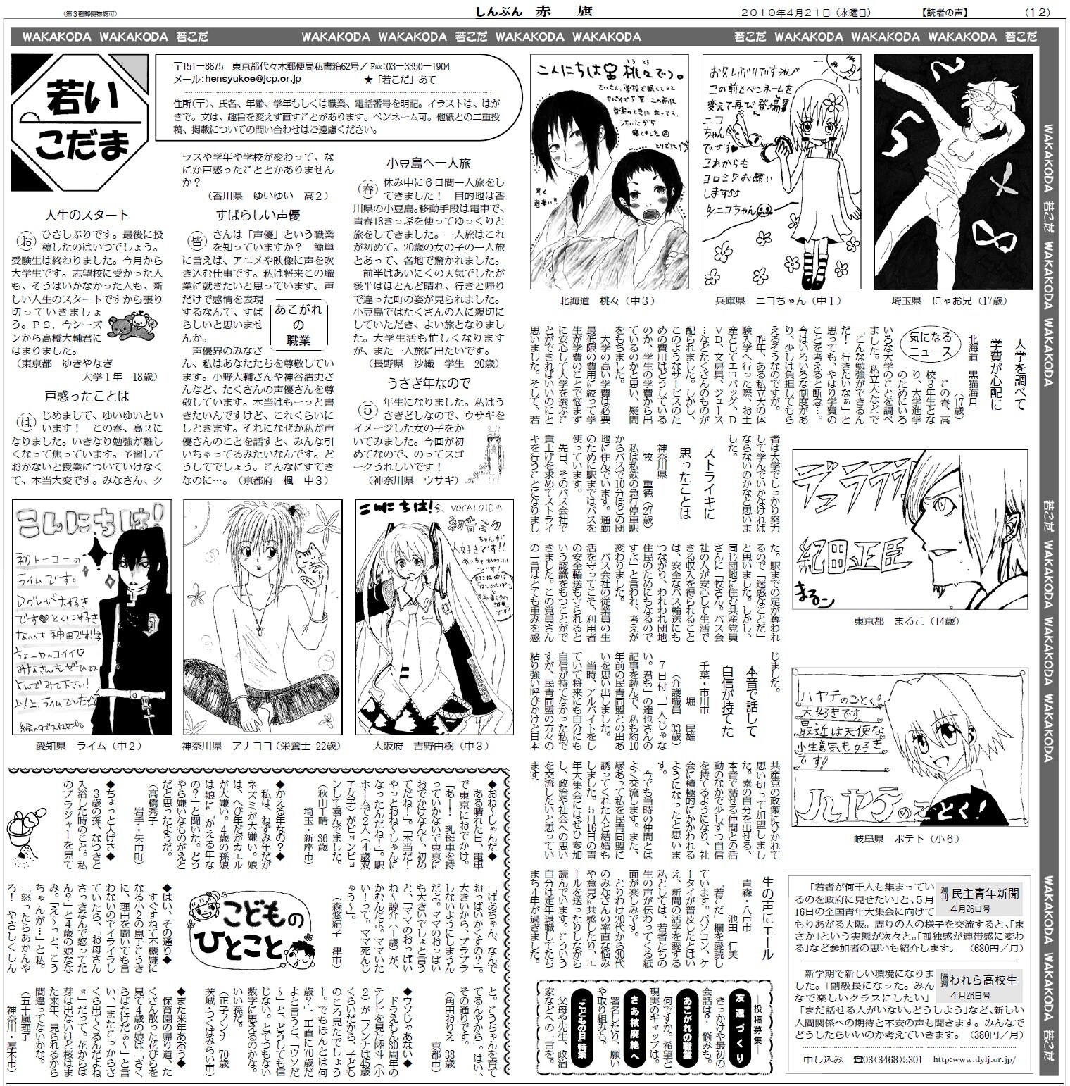 「20代から30代のみなさんの率直な悩みや意見に共感したり、エールを送ったりしながら読んでいます」(女性・4月21日付)と好評なのが、「読者の声」ページの「若いこだま」です。その時々のテーマに寄せられる青年の声、イラストが多彩に掲載されています。