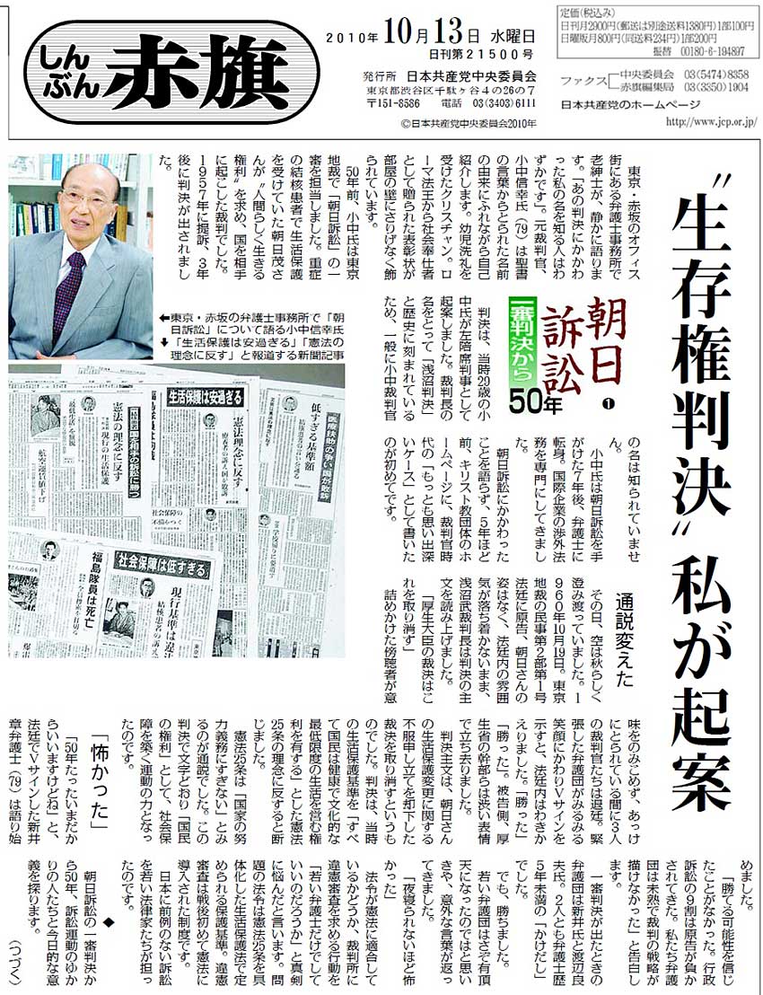 憲法で保障された生存権を「国の努力義務」から文字通りの「国民の権利」にした朝日訴訟。連載「朝日訴訟 一審判決から50年」(紙面)は、社会保障を築く力にあらためて光をあてました。読者からは、「『人間裁判』のいわれは、ほかでは決して目にすることができない記事です。感動的な記事に出会いました」などの感想が寄せられました。
