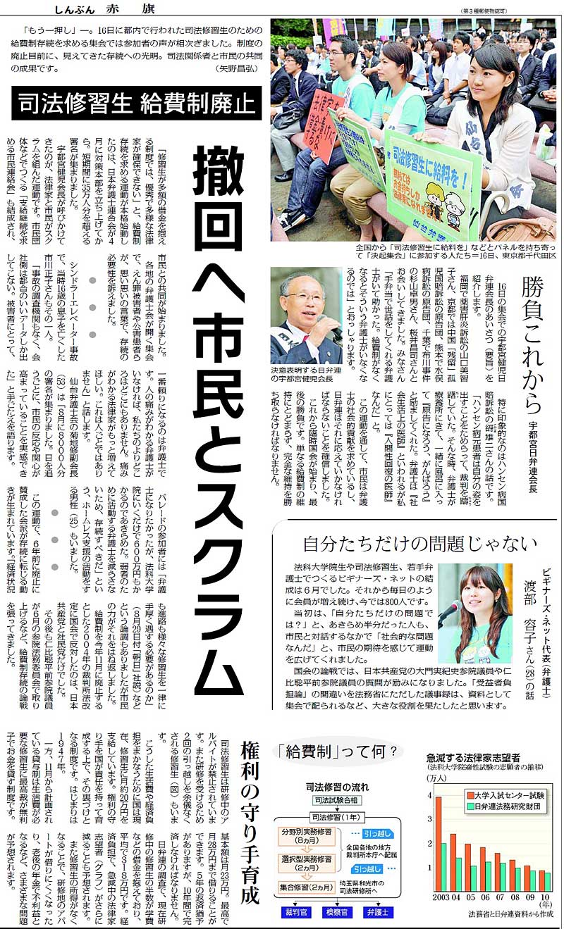 また、司法修習生の給費制を廃止しようとしている問題(紙面)では、一般紙は“受益者負担論”から「なぜ法律家だけ特別扱いか」などと非難するなか、「赤旗」は、存続を主張。制度の理念、戦前の歴史や法科大学院生の困窮ぶりなどリアルな実態を紹介し、人権を擁護するためにも必要な制度であることを示し、関係者から「赤旗さんには感謝しています」との声がかけられました。