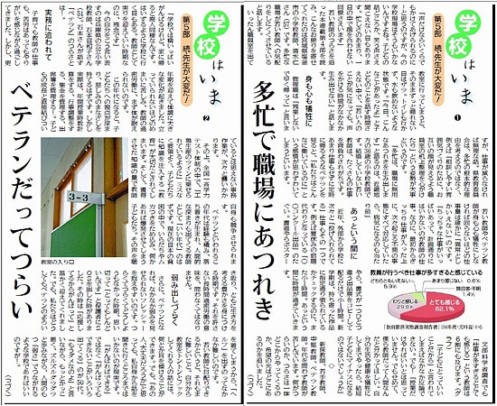 校長のパワーハラスメントで病気になった副校長など、深刻な教育現場の実態をとりあげつつ、問題解決の方向を探る連載「学校はいま」(紙面)。10月の第5部にも、「鋭く問題をえぐりながら、教育をとらえる視点が的確で、苦闘する教師たちへのまなざしが温かく、現場はとても励まされたと思う」など、たくさんの反響が寄せられました。