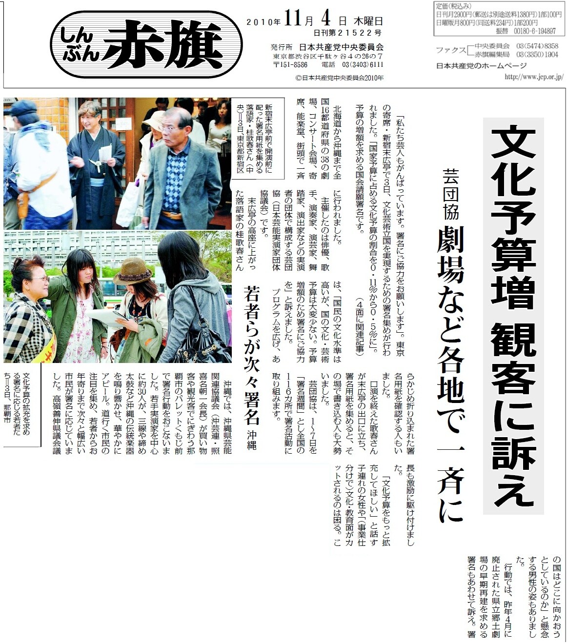 文化予算をせめて国家予算の0・5%にしてほしいという芸団協(野村萬会長)の署名行動や国会請願を逐一報道(記事)。能楽師の野村会長やピアニストの中村紘子さんらの街頭行動を大きく紹介して話題になりました。芸団協は現在71団体が正会員、傘下の実演家は9万人にのぼります。新政権が芸術団体への助成を半減させる方向を打ち出していることに危機感をもち、たちあがったものです。