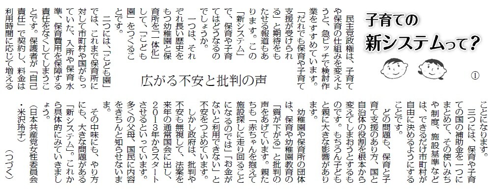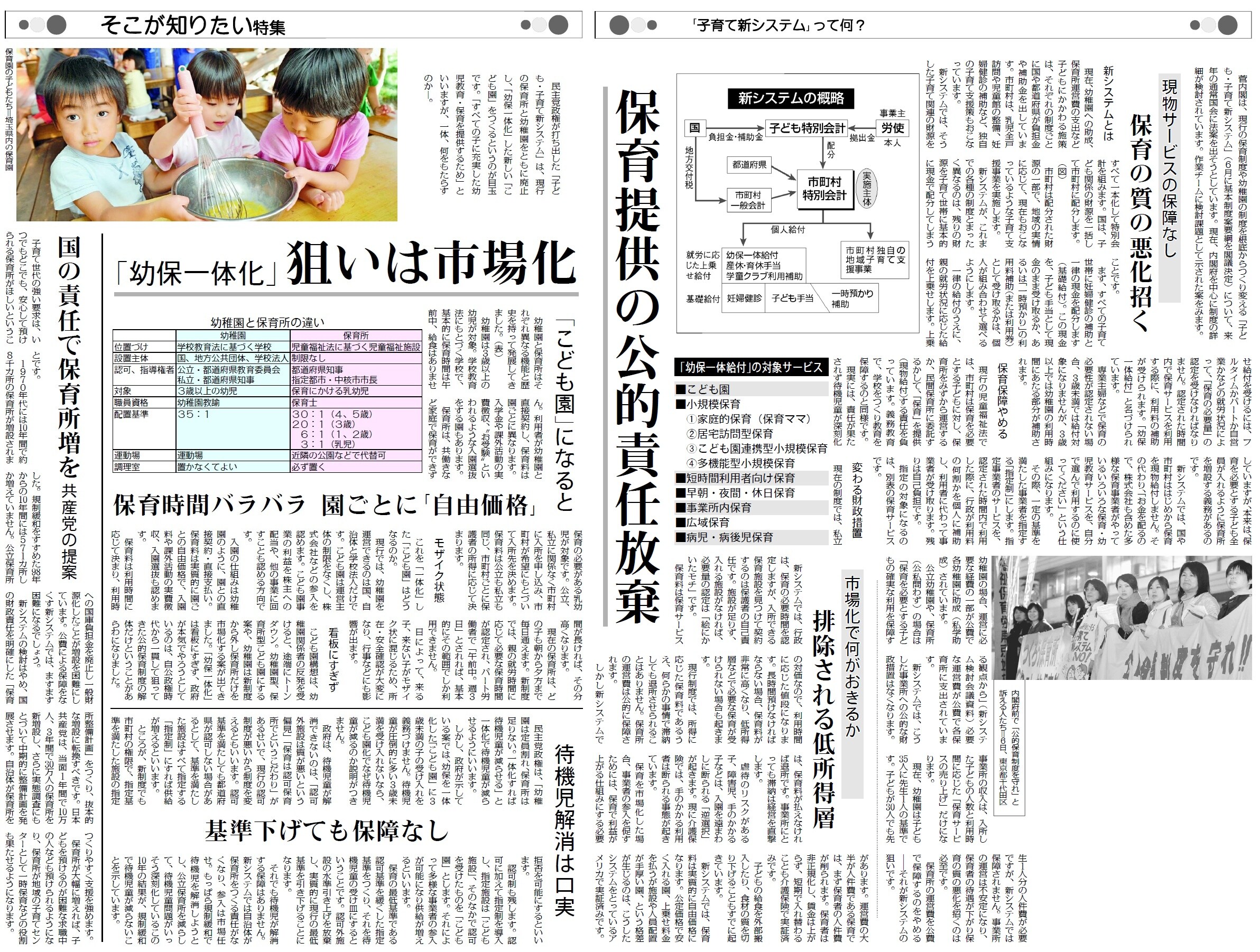 現行の保育制度や幼稚園の制度を根底から悪くする、政府の「子ども・子育て新システム」に国民から批判の声があがっています。連載「子育ての新システムって?」(3日付から開始、記事)や特集(19日付、記事)などで、保育の質の悪化を招き、低所得者層が保育から排除されるといった新システムの問題点と広がる反対運動を紹介しています。