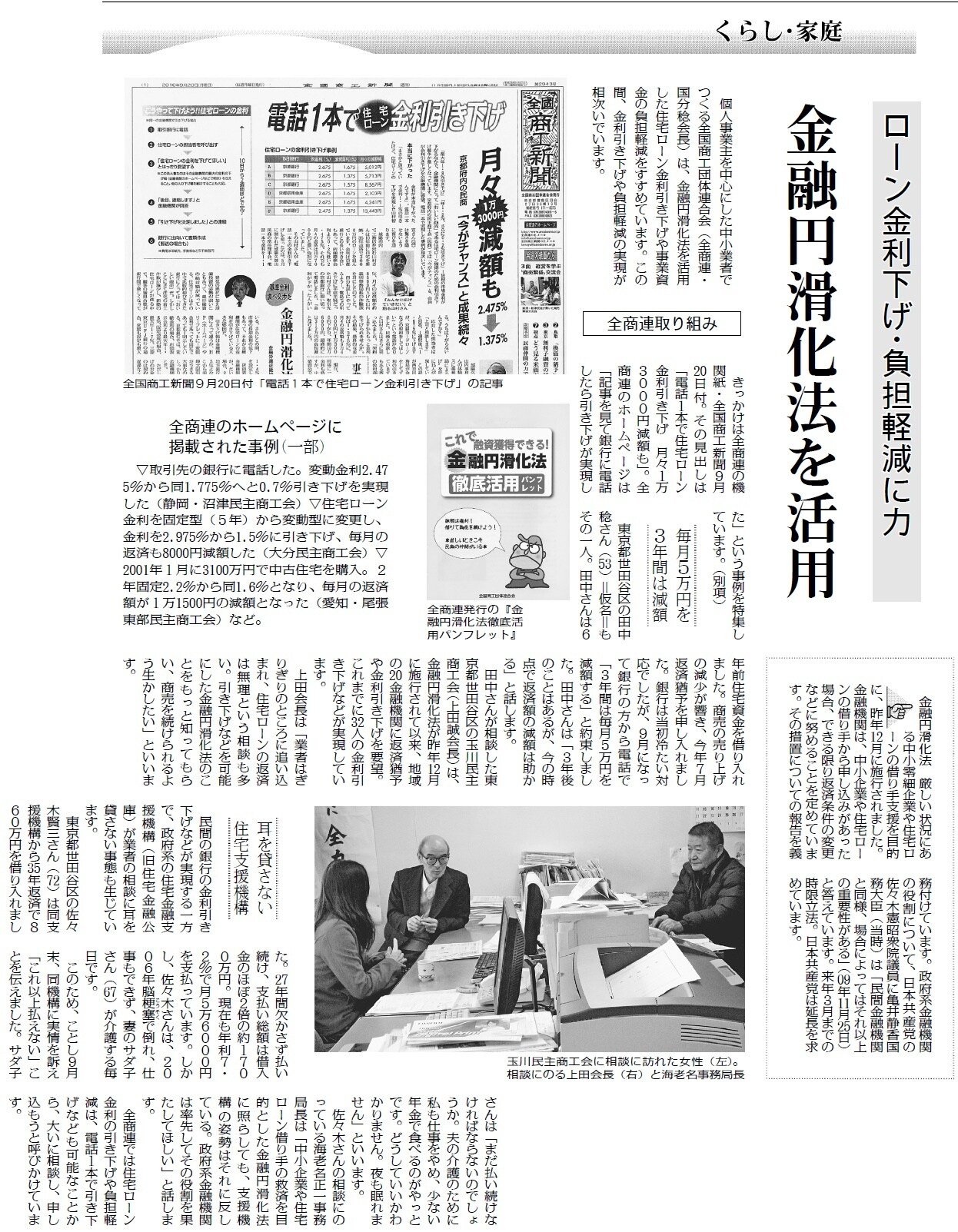 住宅ローンの金利を引き下げることができます―。日曜版(12月12日号)に掲載され大きな反響を呼んでいる、金融円滑化法(昨年12月施行、来年3月までの時限立法)を活用した負担軽減策。日刊紙では、「ローン金利下げ、負担軽減に力 金融円滑化法を活用」(11月24日付、記事)で、全商連のとりくみを紹介し、注目されています。