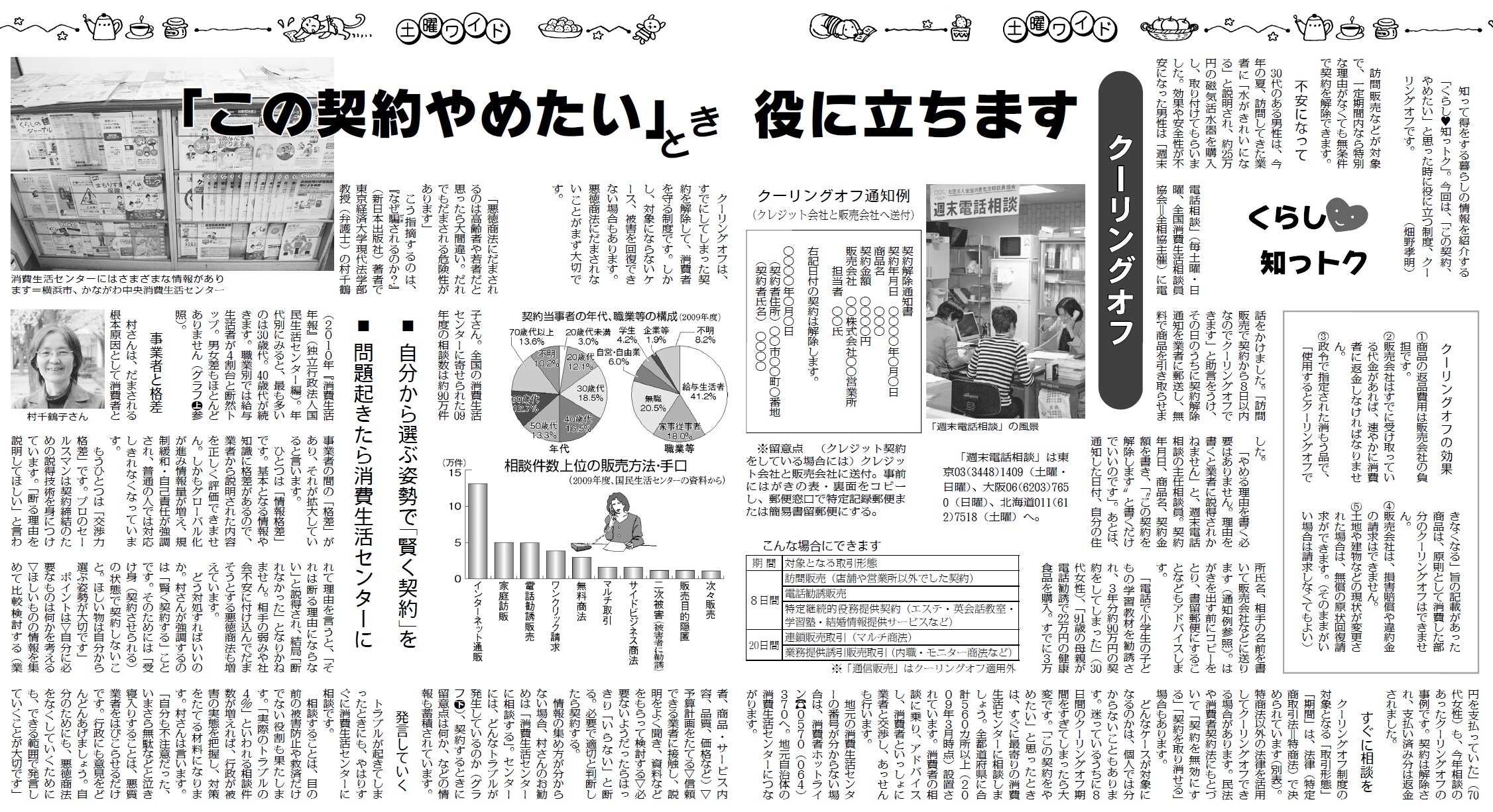 知って得する生活の情報を紹介する新企画「くらし知っトク」がスタート。1回目の「クーリングオフ」(4日付、記事)は、業者との契約をやめたいときに役立つ知恵を掲載。2回目は、「職場の受動喫煙被害と対策」をとりあげる予定です。