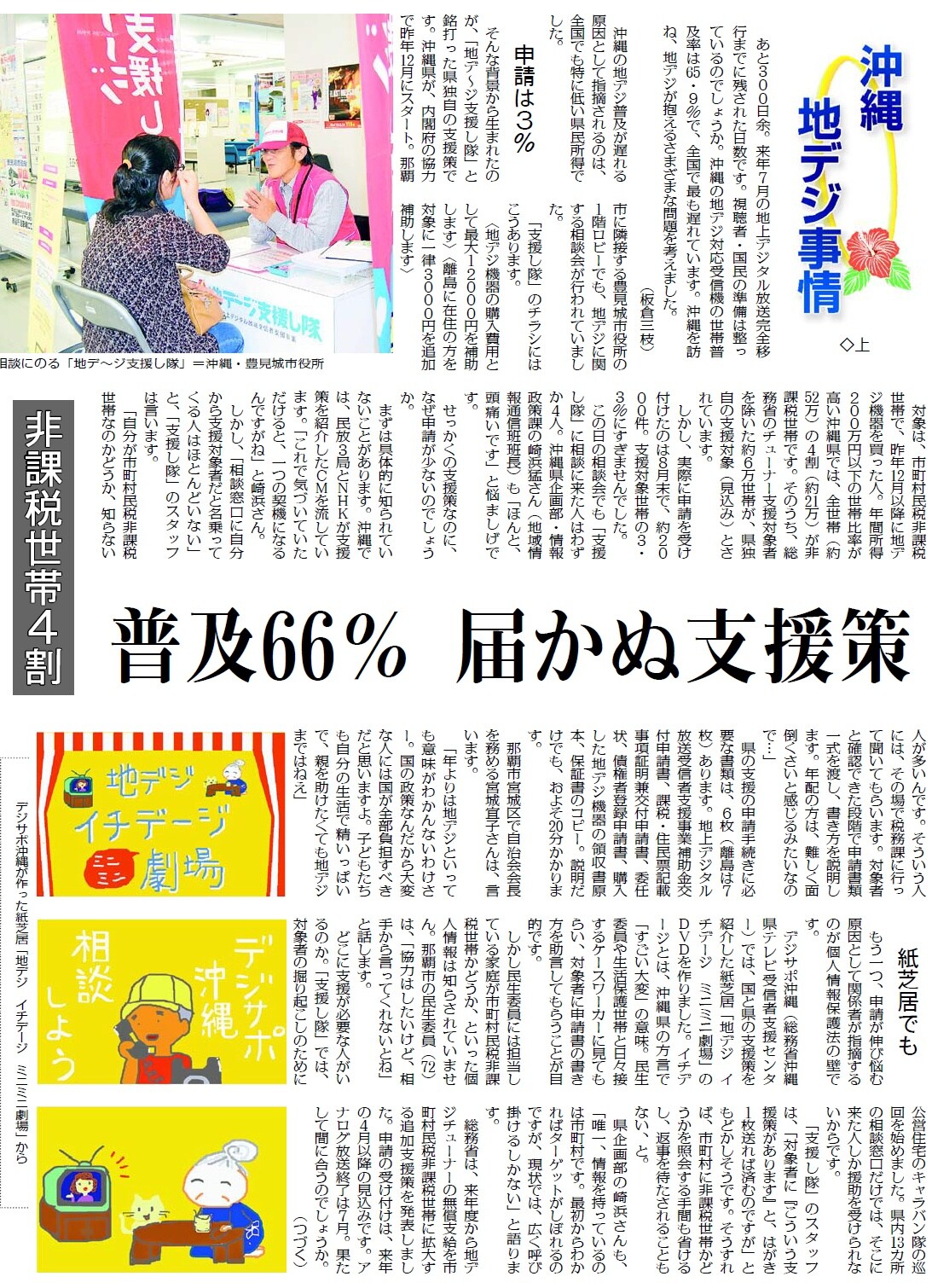 来年7月24日には地上デジタルへの完全移行が予定されています。地デジの問題や役立つ情報をいち早く、わかりやすく取り上げてきました(記事)。国民の立場から「このままでは多くのテレビ難民が出る」と警鐘を鳴らし、アナログ停波時期の延期を求める論陣を張ってきました。「延期」に踏み込めない他紙との違いが鮮明です。