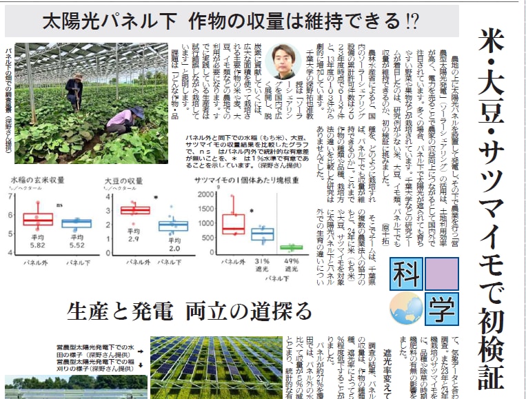 農地の上に太陽光パネルを設置して発電し、その下で農業を行う「営農型太陽光発電」(ソーラーシェアリング)の活用は、土地利用効率が高く、電力を売ることで農家の収益向上につながるとして国内外で注目されています。多くの場合、パネル下で太陽光が遮られても育ちやすい野菜や果物などが栽培されています。千葉大学などの研究チームが着目したのは、研究例が少ない米、大豆、イモ類。パネル下でも収量が維持できるのか、初の検証に挑みました。(原千拓)
