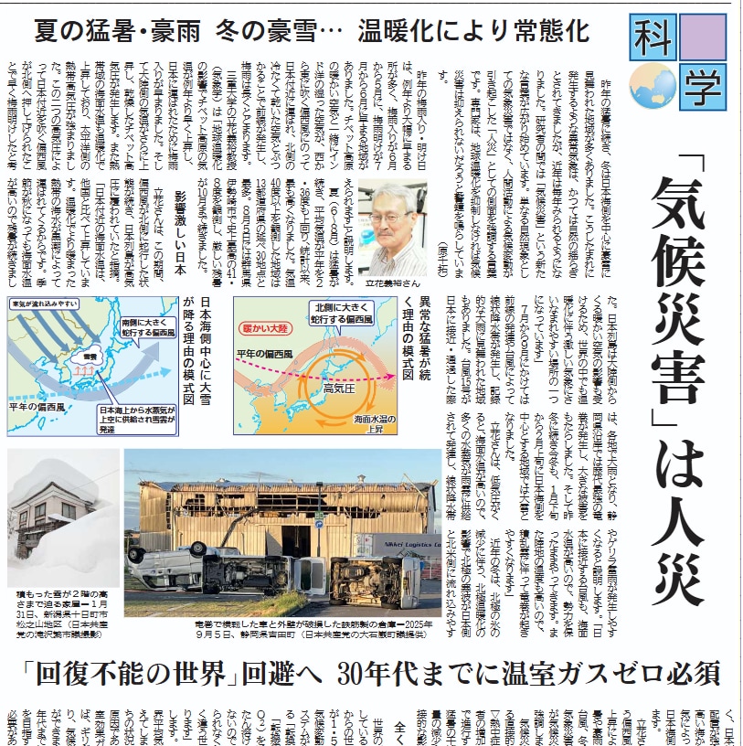 昨年の猛暑に続き、冬は日本海側を中心に豪雪に見舞われた地域が多くありました。こうしたまれに発生するような異常気象は、かつては自然の揺らぎとされてきましたが、近年は毎年みられるようになりました。研究者の間では「気候災害」という新たな言葉が広がり始めています。単なる自然現象としての気象災害ではなく、人間活動による気候変動が引き起こした「人災」としての側面を強調する言葉です。専門家は、地球温暖化を抑制しなければ気候災害は抑えられないだろうと警鐘を鳴らしています。(原千拓)