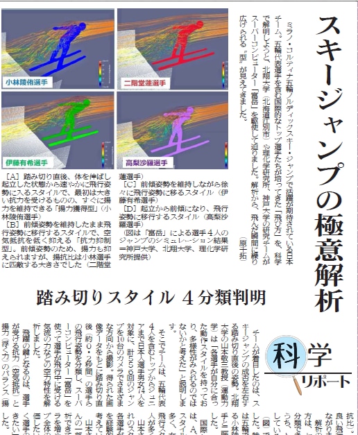 ミラノ・コルティナ五輪で注目された、ノルディックスキー・ジャンプ。五輪代表選手を含む国際的なトップ選手たちが培ってきた「飛び方」を、科学で解明しようと、北翔大学(北海道江別市)や理化学研究所、神戸大学の研究チームがスーパーコンピューター「富岳」を駆使して迫りました。解析から、飛んだ瞬間に繰り広げられる“型”が見えてきました。(原千拓)