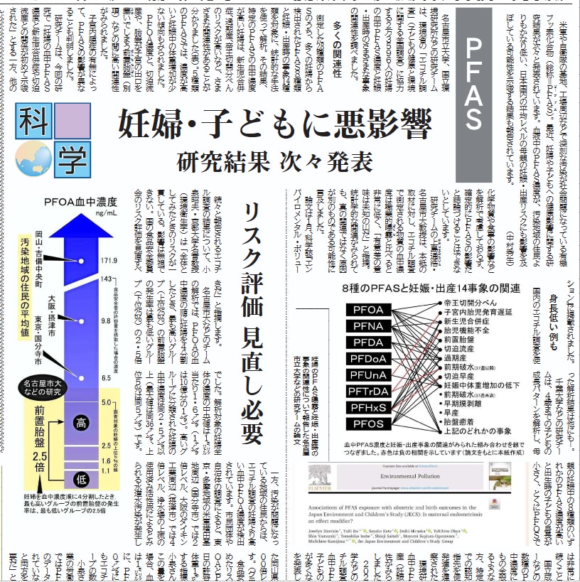 米軍や自衛隊の基地、工場周辺などで深刻な汚染が社会問題になっている有機フッ素化合物(総称=PFAS〈ピーファス〉)。最近、妊婦や子どもへの健康影響に関する研究結果が次々と発表されています。血液中のPFAS濃度が、汚染地域の住民よりもかなり低い、日本国内の平均レベルの母親の妊娠・出産リスクにも影響を及ぼしている可能性を示唆する結果も報告されています。(中村秀生)