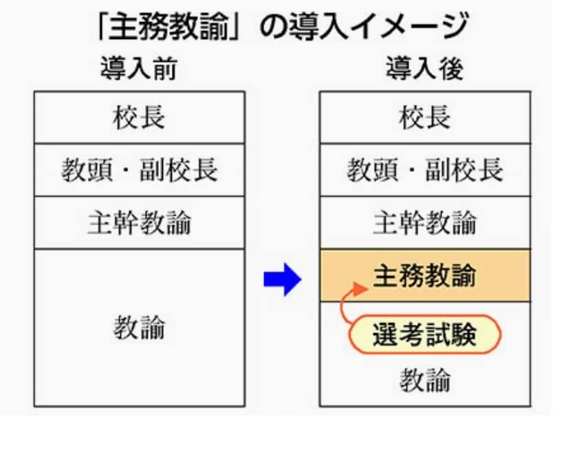 「主務教諭」は「主幹教諭」(置いていないところもある)と「教諭」の間に置くことができる職階です。8割近くいる教諭を二つに分けることで、新たな階層が生まれます(図)。公立学校教員の残業代不支給制度を温存する「改定教員給与特別措置法」(給特法、6月成立)によるものです。