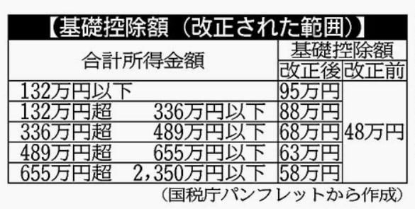 合計所得金額に応じて基礎控除額が改正されました(表)。昨年まで48万円だった納税者(本人の合計所得金額が2350万円以下)については、それぞれ引き上げられました。さらに、合計所得金額が132万円以下であれば、基礎控除額が95万円になります。