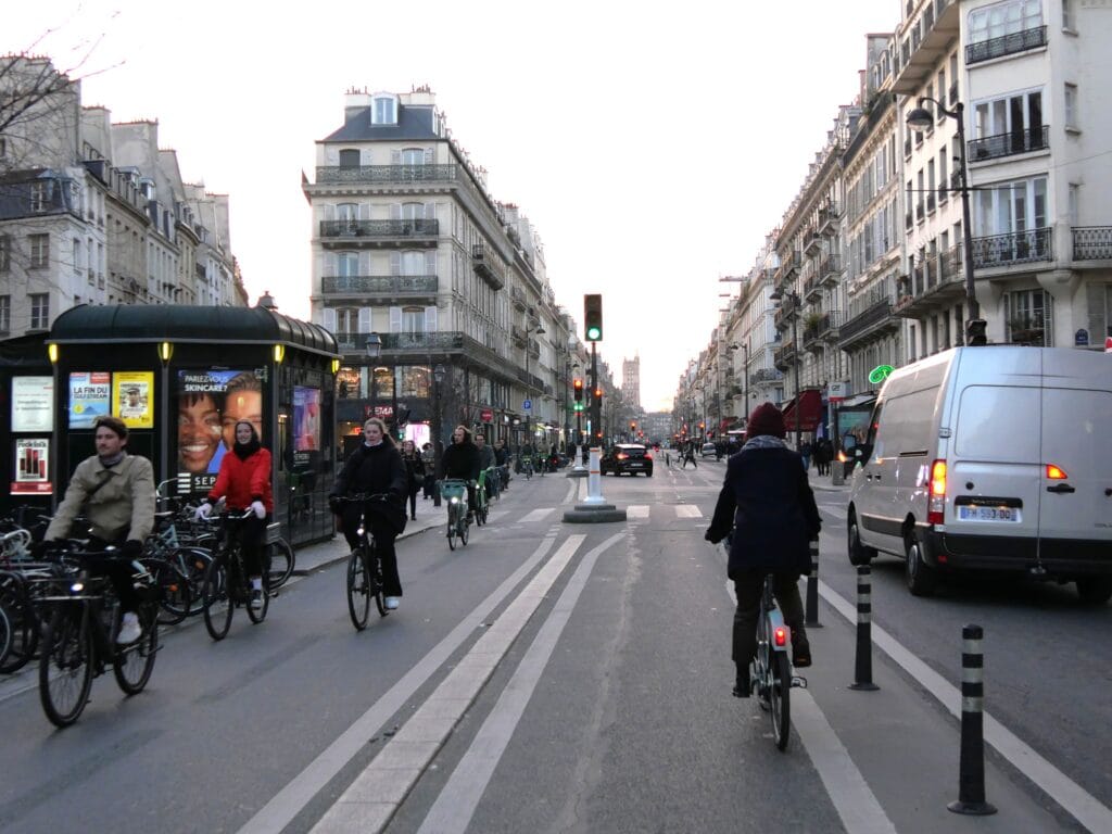 2025年3月、パリのリヴォリ通り。車道はマイカー禁止の1車線のみを残して自転車道に転換されている。自転車が交通手段として利用される割合は、2010年の3%から23年までに11%を超えた