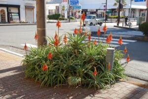 普段はひっそりと街の風景に溶け込んでいるんだけど、開花すると一気に艶やかな姿に変身する。その二面性に憧れにも近い思いを抱いており、冬の間は、街なかでついつい、アロエの花を探してしまいます。
