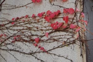 少し目線を上げてみると、建物の壁面や街路樹に張り付いたツタが紅葉し、グラデーションを生み出していることがあります。赤く染まった葉が描き出す壁画は、偶然の作品。落葉したあとの「線描」もまた、美しい。近づいて見てみると、壁にくっつく巻きひげの先端に、カエルの手のようなかわいらしい吸盤が見えます。