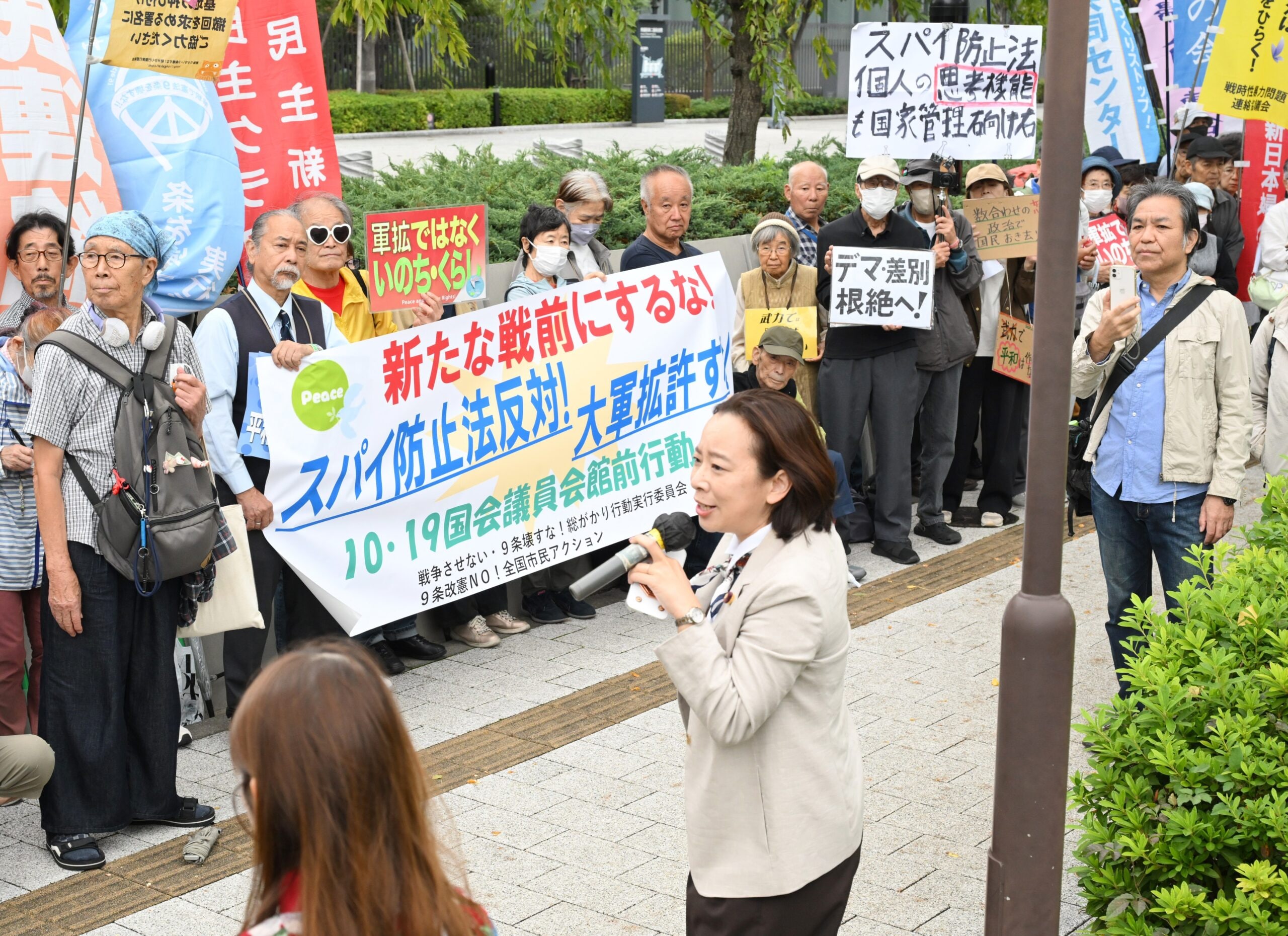 「スパイ防止法」や大軍拡に反対する人たち。訴えるのは日本共産党の吉良よし子参院議員=10月19日、衆院第2議員会館前
