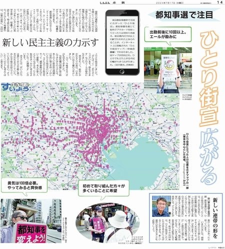 東京都知事選挙で全国に広がった「ひとり街宣」。都知事選を通じて街角でプラカードを持って立った人は3000人を超え、東京都内の700以上の駅で行われたとみられることが、インターネット上に投稿された「ひとり街宣マップ」(中央の画像)でわかりました。同マップが活用され、ひとりでも立ち上がる市民の輪が大きく広がりました。(宮井貴光、若林明)