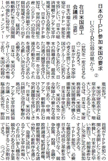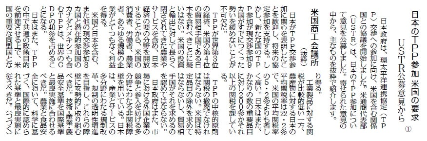 環太平洋連携協定(TPP)を考える資料として、日本のTPP参加について、米通商代表部(USTR)が公募した意見から、主なものを抜粋で紹介します。
