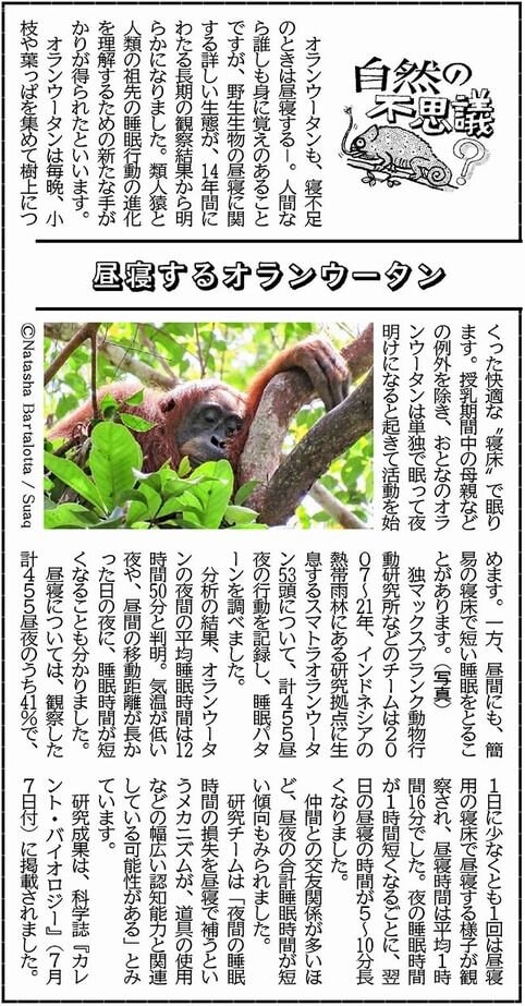 【自然の不思議】昼寝するオランウータン(8月3日付)