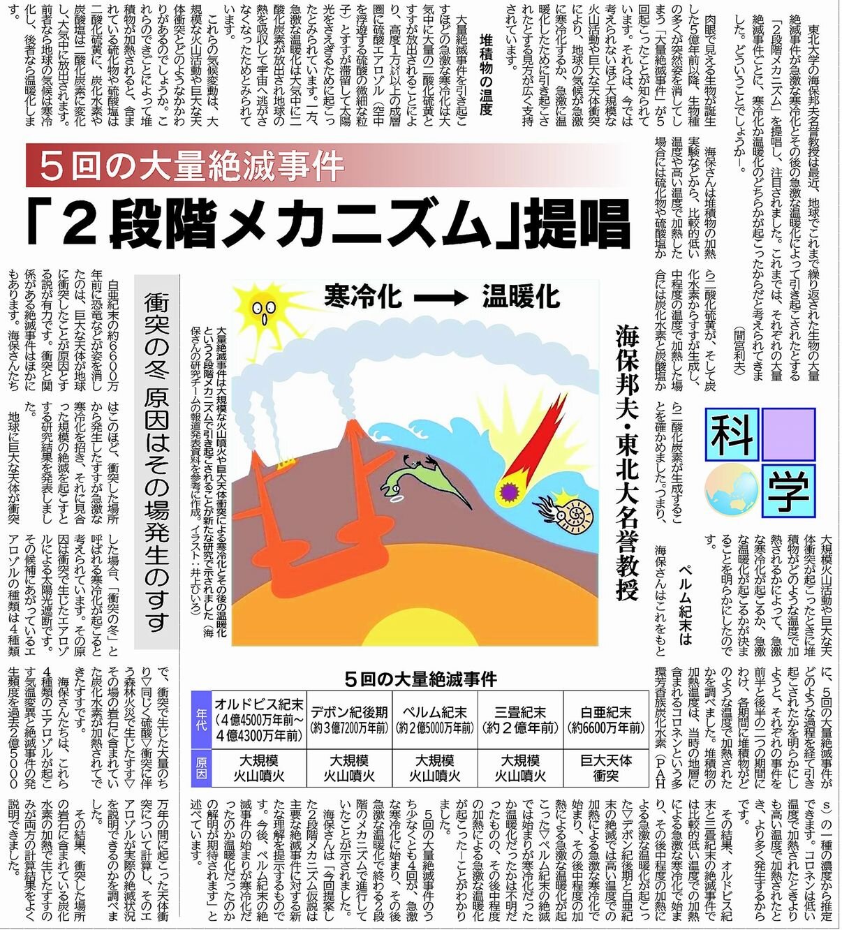 大量絶滅引き起こした気候変動/寒冷化か温暖化か/堆積岩の加熱がカギ(6月23日付)