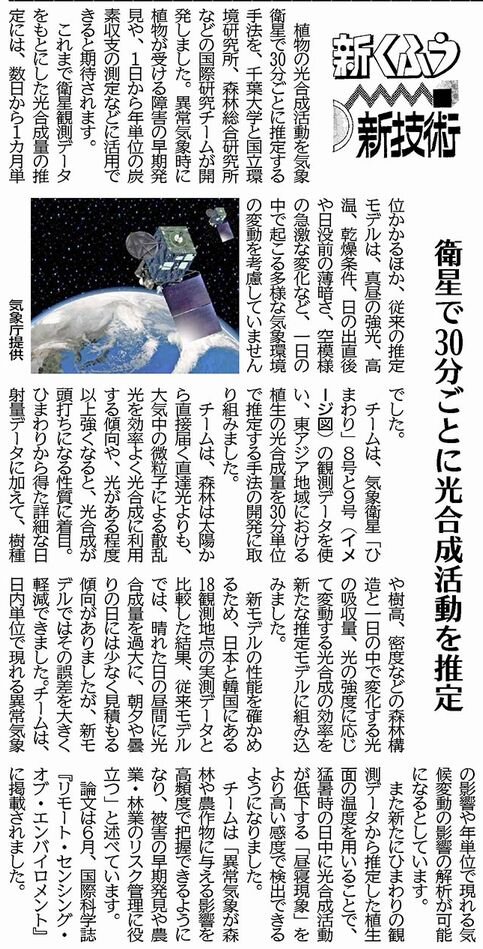 【新くふう新技術】衛星で30分ごとに光合成活動を推定(10月12日付)