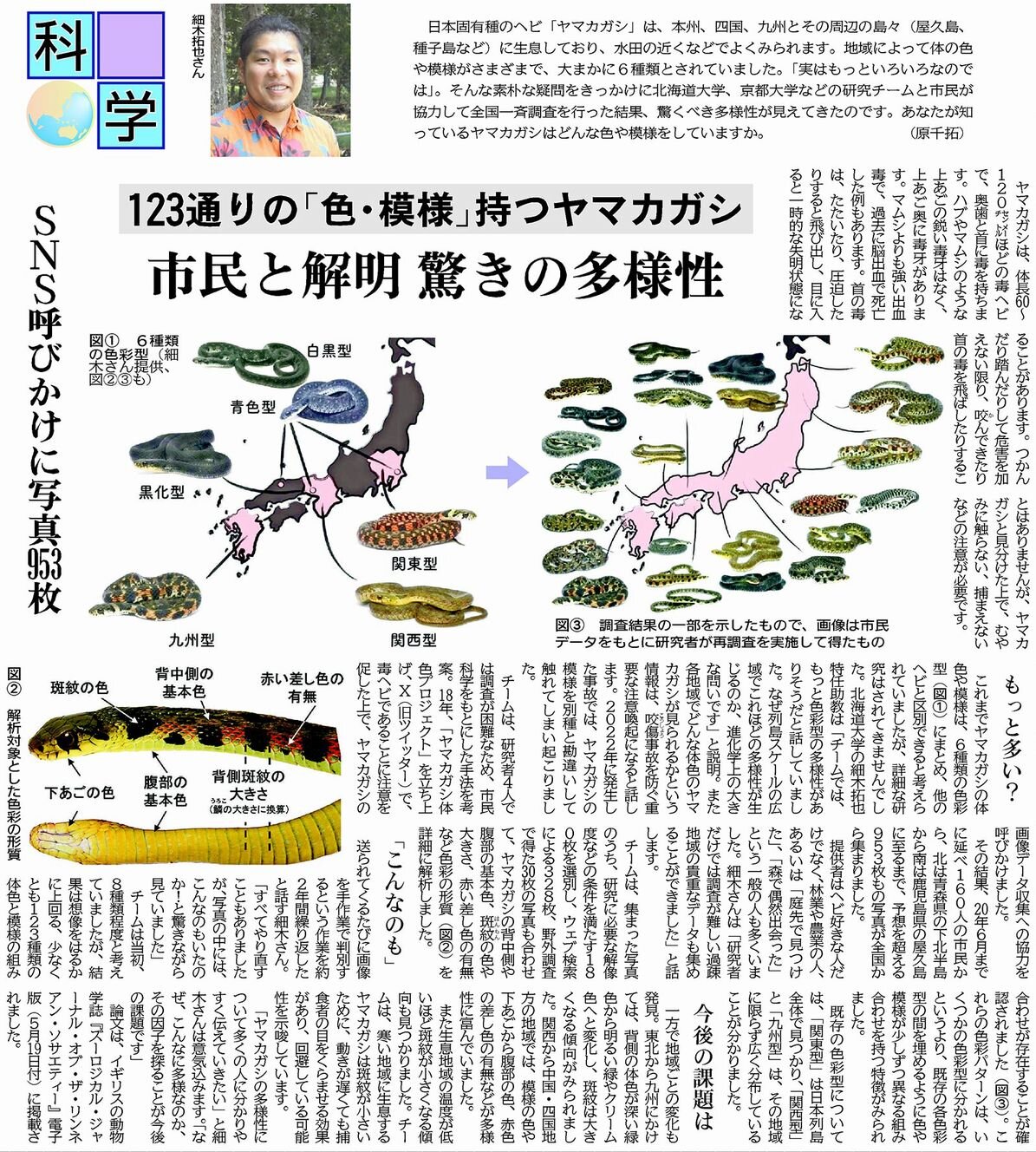 123通りの「色・模様」もつヤマカガシ/市民と解明 驚きの多様性(9月28日付)