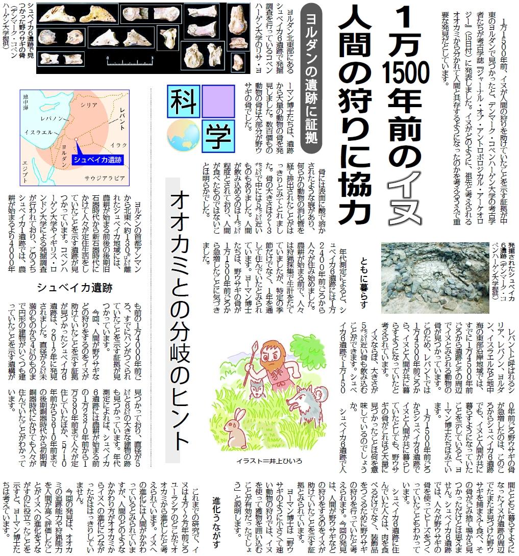 1万1500年前のイヌ 人間の狩りに協力(1月28日付)