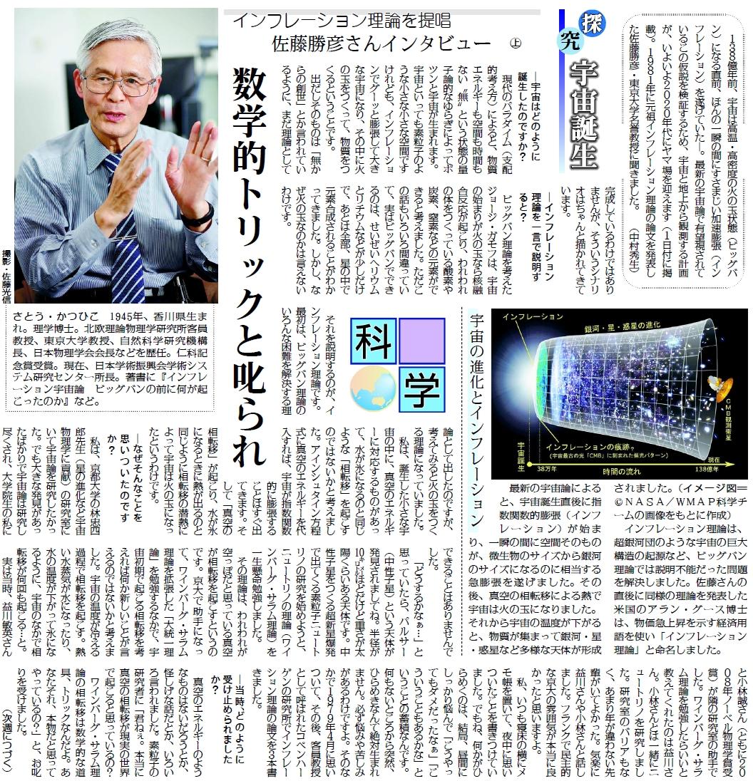 探究 宇宙誕生 インフレーション理論を提唱 佐藤勝彦さんに聞く(上)(1月13日付)