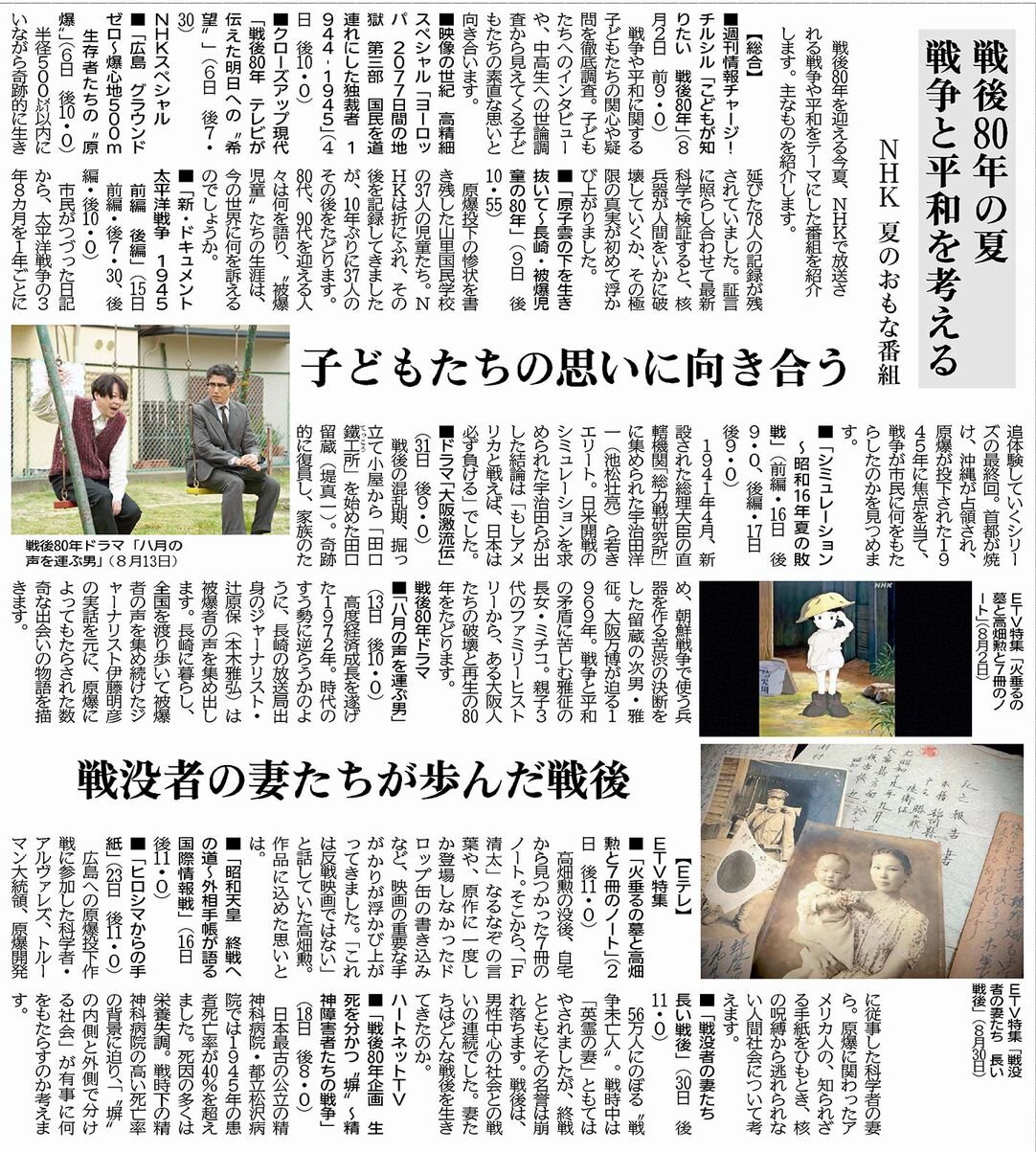 戦後80年を迎える夏、NHKで放送される戦争や平和をテーマにした番組を紹介します。主なものを紹介します。(紙面を見る)