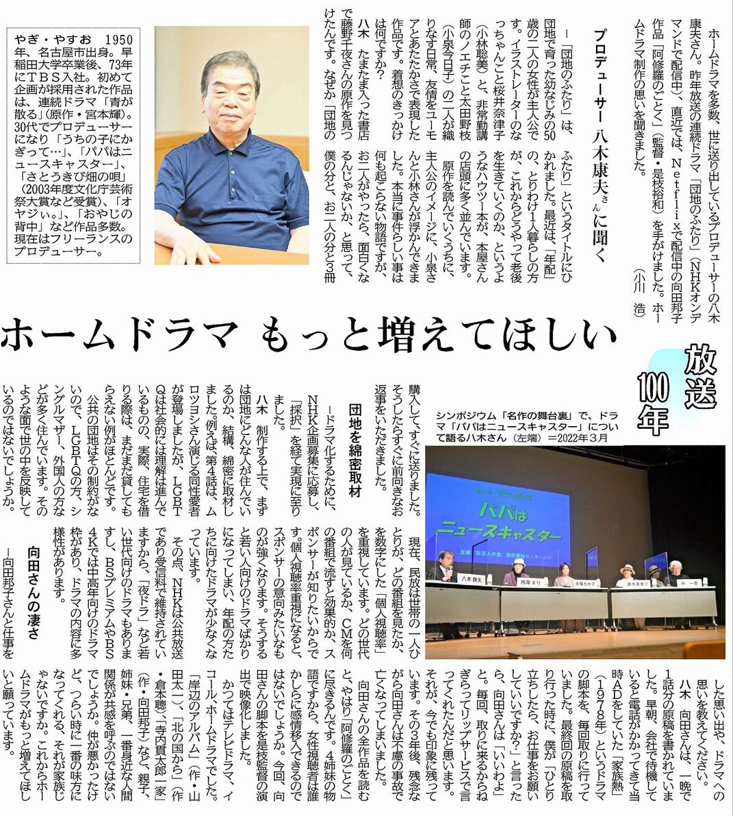 ホームドラマを多数、世に送り出しているプロデューサーの八木康夫さん。昨年放送の連続ドラマ「団地のふたり」(NHKオンデマンドで配信中)、直近では、Netflixで配信中の向田邦子作品「阿修羅のごとく」(監督・是枝裕和)を手がけました。ホームドラマ制作の思いを聞きました。(紙面を見る)