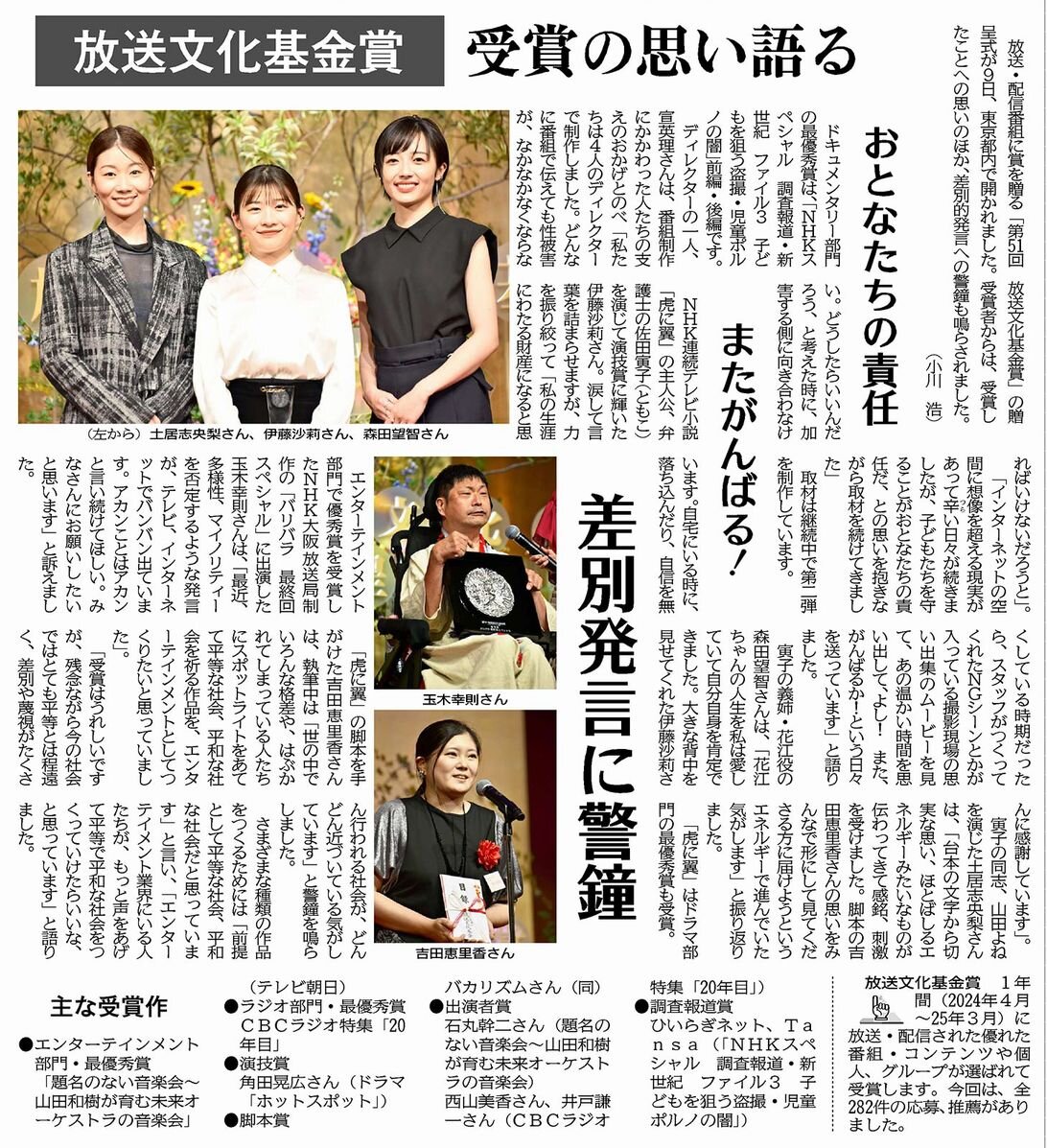 放送・配信番組に賞を贈る「第51回 放送文化基金賞」の贈賞式が9日、東京都内で開かれました。受賞者からは、受賞したことへの思いのほか、ヘイトスピーチへの警鐘も鳴らされました。(紙面を見る)