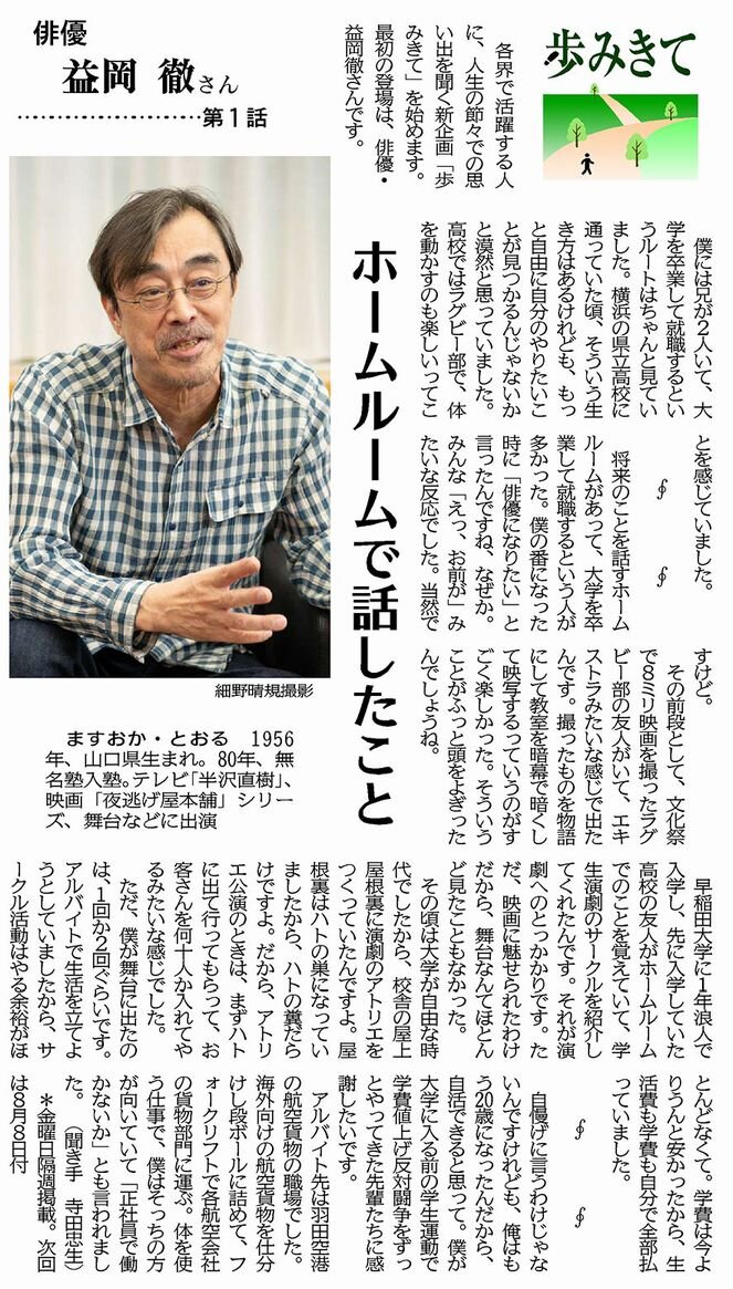 各界で活躍する人に、人生の節々での思い出を聞く新企画「歩みきて」が始まりました。トップバッターは俳優・益岡徹さんが登場。第1話では高校時代のホームルームで「俳優になりたい」と突然話したこと、大学時代の演劇サークルやアルバイトの思い出などを語っています。(紙面を見る 7月25日)