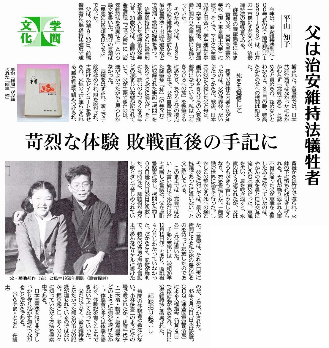 平山さんの父・菊池邦作さんは1932年に治安維持法違反で逮捕され、苛烈な拷問で死も覚悟しました。敗戦直後に体験を手記にしていた父のこと、市民の記録を掘り起こすことの意味とは...。(紙面を見る 7月22日)