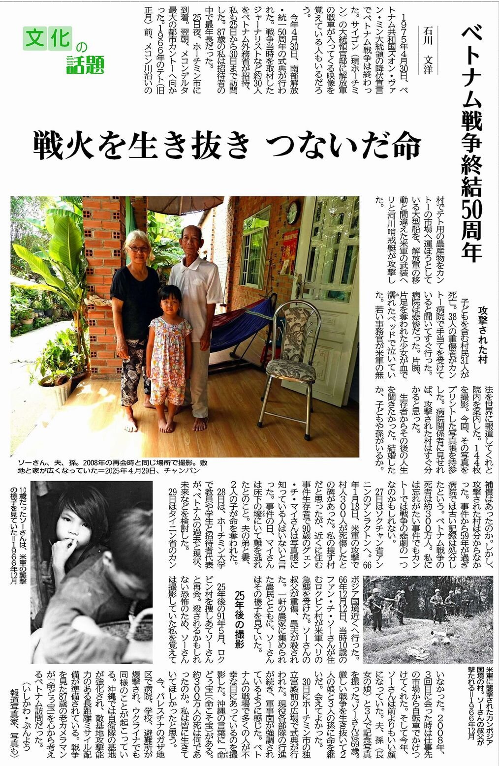 今年4月、ベトナム戦争終結50周年の記念式典に参加するため同国を訪れた石川さん。戦争中に出会って、戦後も交流を続ける人たちと再会し、子どもや孫と一緒に家族写真を撮影。「命どぅ宝(命こそ宝)」の思いを込めたエッセーです。(紙面を見る 7月4日)