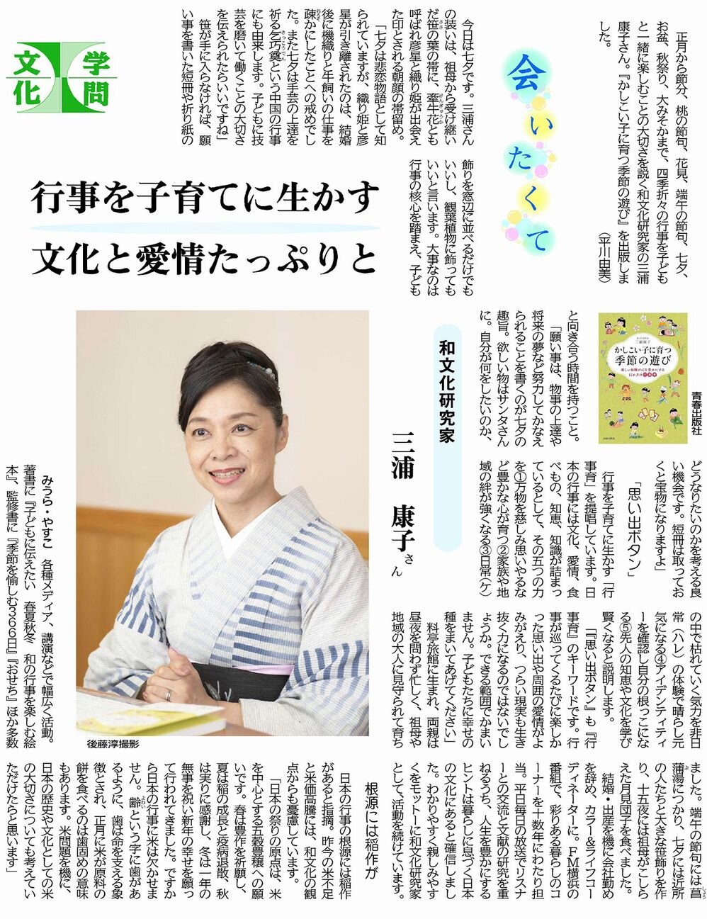 四季折々の行事を子育てに生かす「行事育」を提唱する三浦さん。愛情、食べもの、知恵、知識が詰まっている日本の行事を親子一緒に楽しむことを推奨します。その経験は幸せの種となり、子どもが人生を生き抜く力になる、と。日本の行事の根源にある稲作文化についても解説し、昨今のコメ問題にも触れます。(紙面を見る 7月7日)