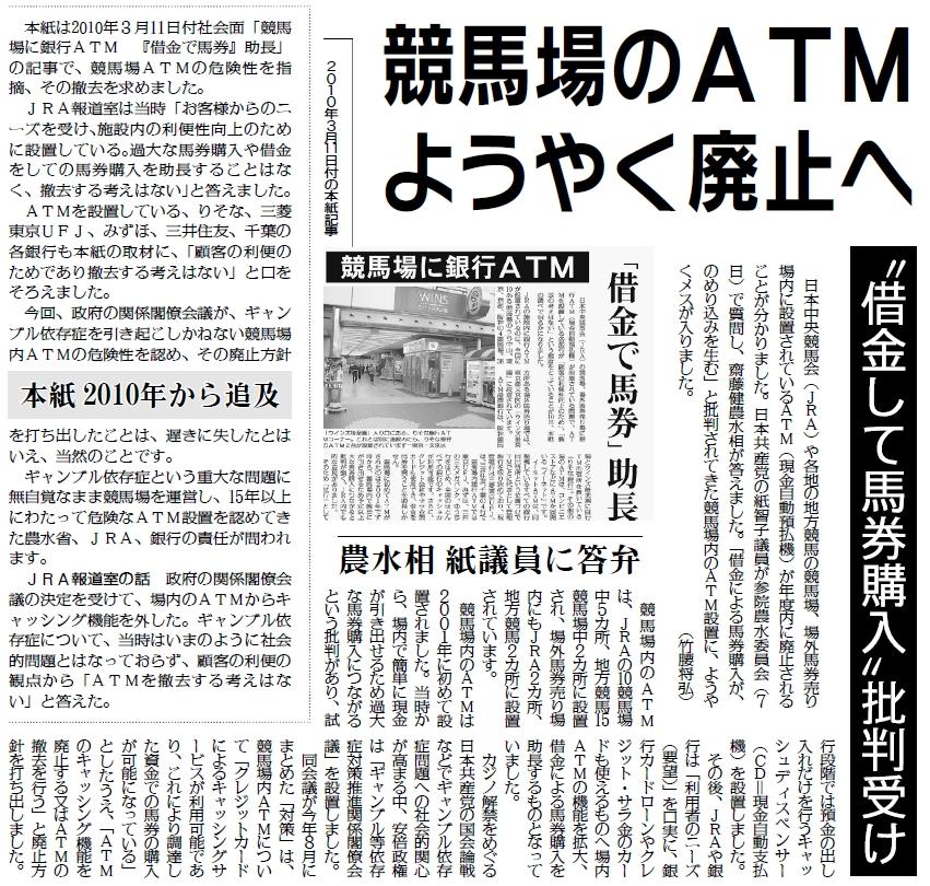 ・競馬場ATMの銀行カードローン対策/農水省が検討指示/野放し批判の本紙報道受け(12月23日)