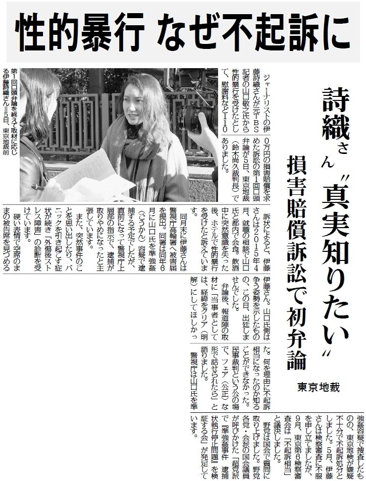 安倍首相と関係が深い元TBS記者の山口敬之氏から性的暴行を受けたとして提訴した伊藤詩織さん。「赤旗」はこの問題を追及します。