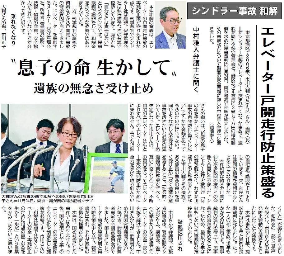 ・シンドラー事故和解/エレベーター戸開走行防止策盛る/遺族の無念さ受け止め/中村雅人弁護士に聞く(12月04日)