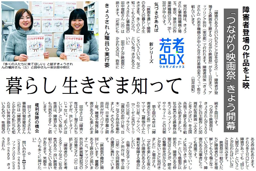 ・「つながり映画祭」きょう開幕/障害者登場の作品を上映/きょうされん職員ら実行委(12月09日)