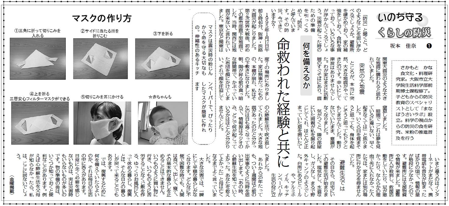 ★金曜大型連載は、食文化・料理研究家の坂本佳奈さんが紹介する「いのち守るくらしの防災」。1回目は「何を備えるか 命救われた経験と共に」(紙面を見る、3月6日付)