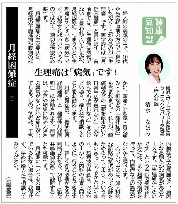 ★水曜掲載の健康豆知識。10月は「月経困難症」。1回目は「生理痛は『病気』です!」(紙面を見る、10月1日付)