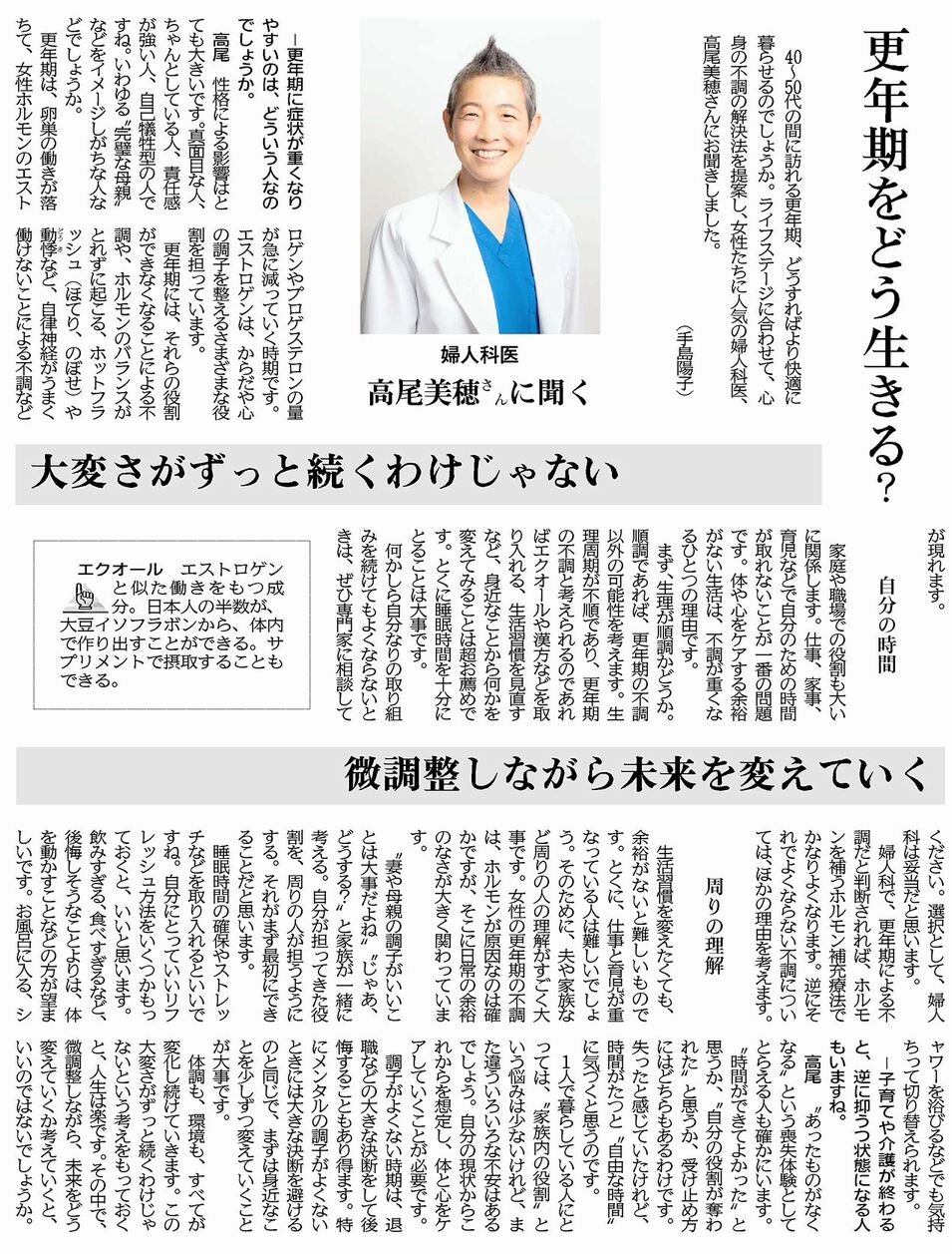 ★更年期、どうすればより快適に暮らせるのでしょうか。ライフステージに合わせて、心身の不調の解決法を提案し、女性たちに人気の婦人科医、高尾美穂さんに聞きました。(紙面を見る、9月26日付)