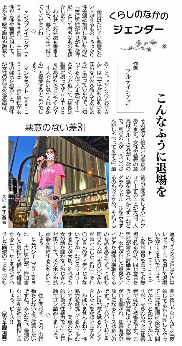 ★第2土曜掲載の「くらしのなかのジェンダー」。第86回は、作家・アルテイシアさんの「悪意のない差別 こんなふうに退場を」(紙面を見る、9月13日付)