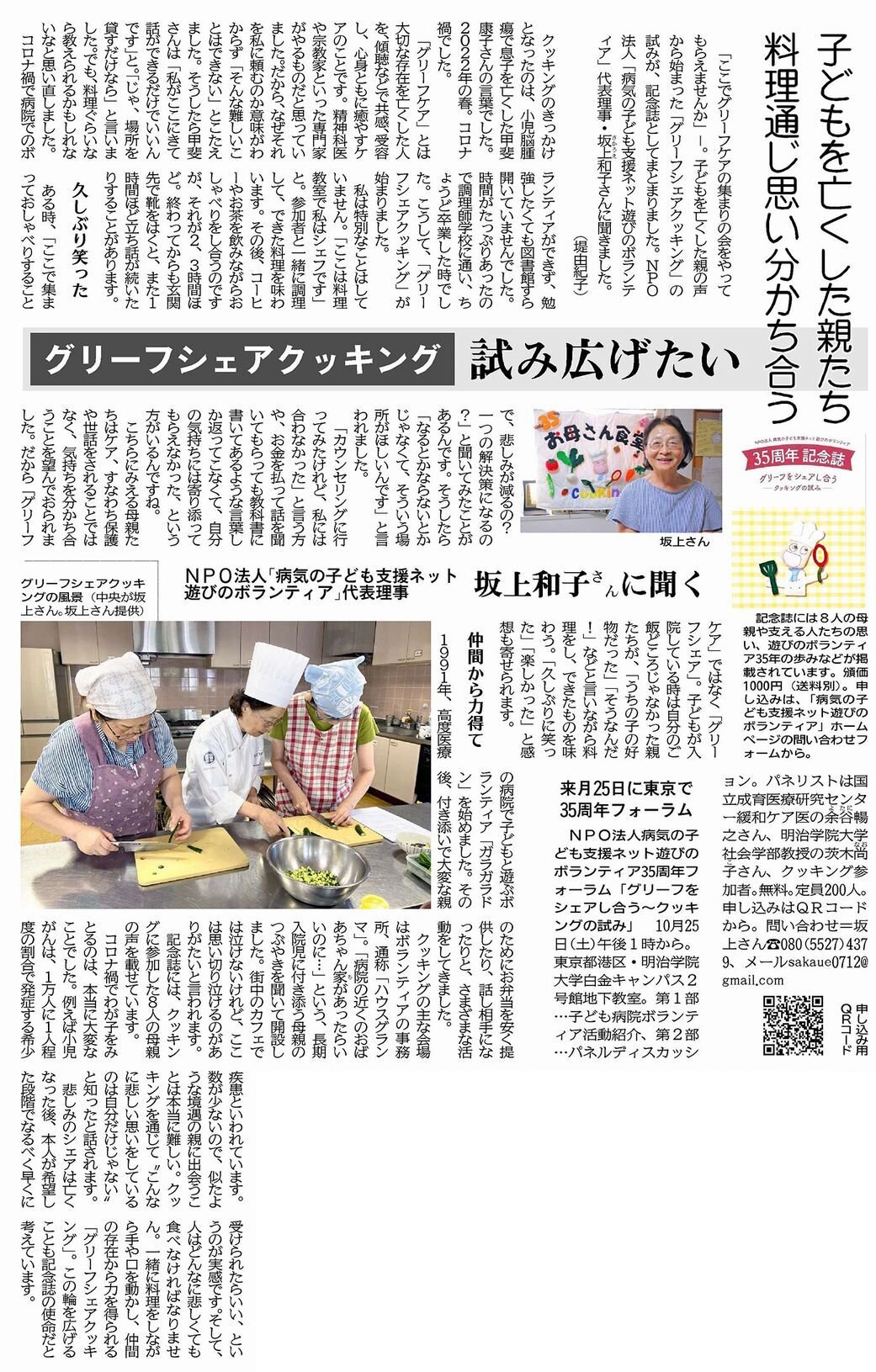 ★「ここでグリーフケアの集まりをやってもらえませんか」―。子どもを亡くした親の声から始まった「グリーフシェアクッキング」の試みが、記念誌としてまとまりました。NPO法人「病気の子ども支援ネット遊びのボランティア」代表理事、坂上和子さんに聞きました。(紙面を見る、9月24日付)