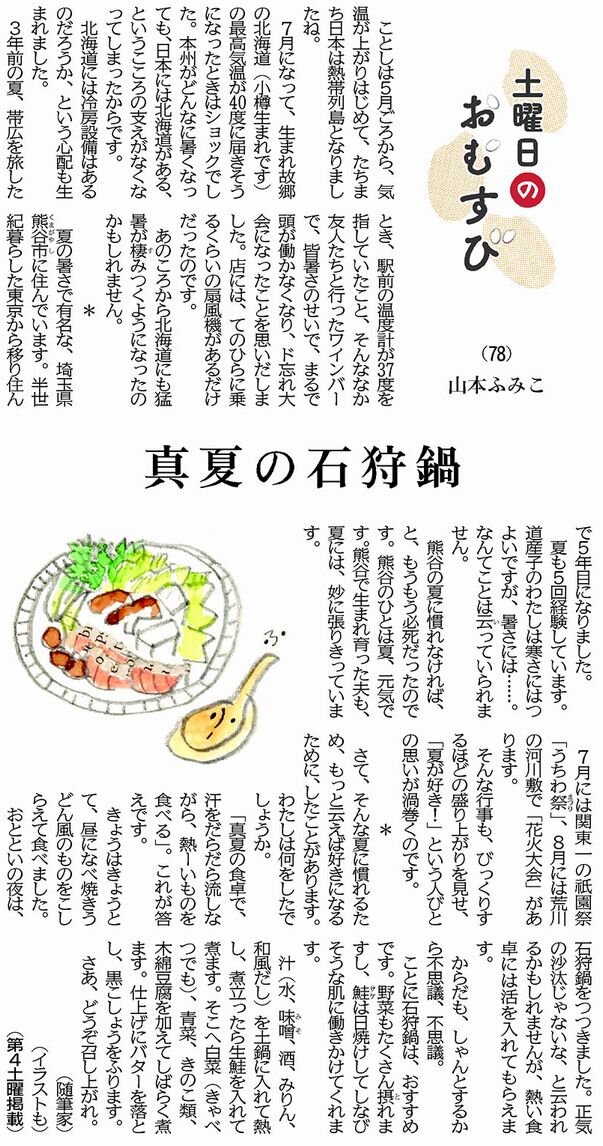★随筆家・山本ふみこさんの「土曜日のおむすび」(第4土曜掲載)。第78回は「真夏の石狩鍋」(紙面を見る、9月27日付)