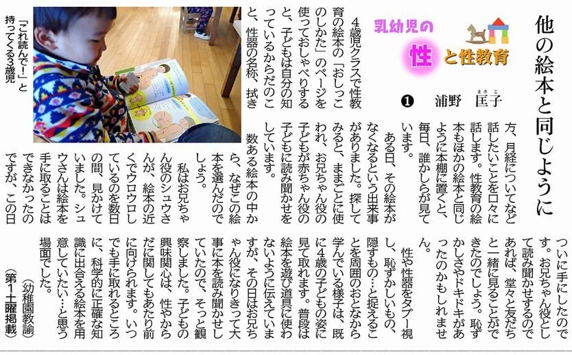 ★幼稚園教諭・浦野匡子さんの新連載「乳幼児の性と性教育」(第1土曜掲載)が始まりました。1回目は「他の絵本と同じように」(紙面を見る、10月4日付)
